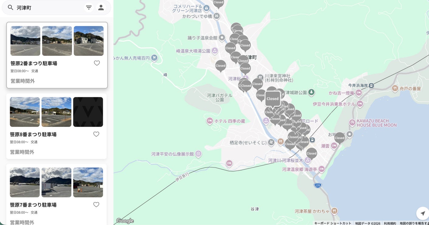 河津桜まつり会場周辺の主要な駐車場5箇所(計約300台分)に計6台のAIカメラを設置、混雑状況を検知してリアルタイムでWebページへ配信します。あわせて、管理画面からの更新により、近隣駐車場20箇所(車:758台、バイク:100台)の混雑状況も提供します。