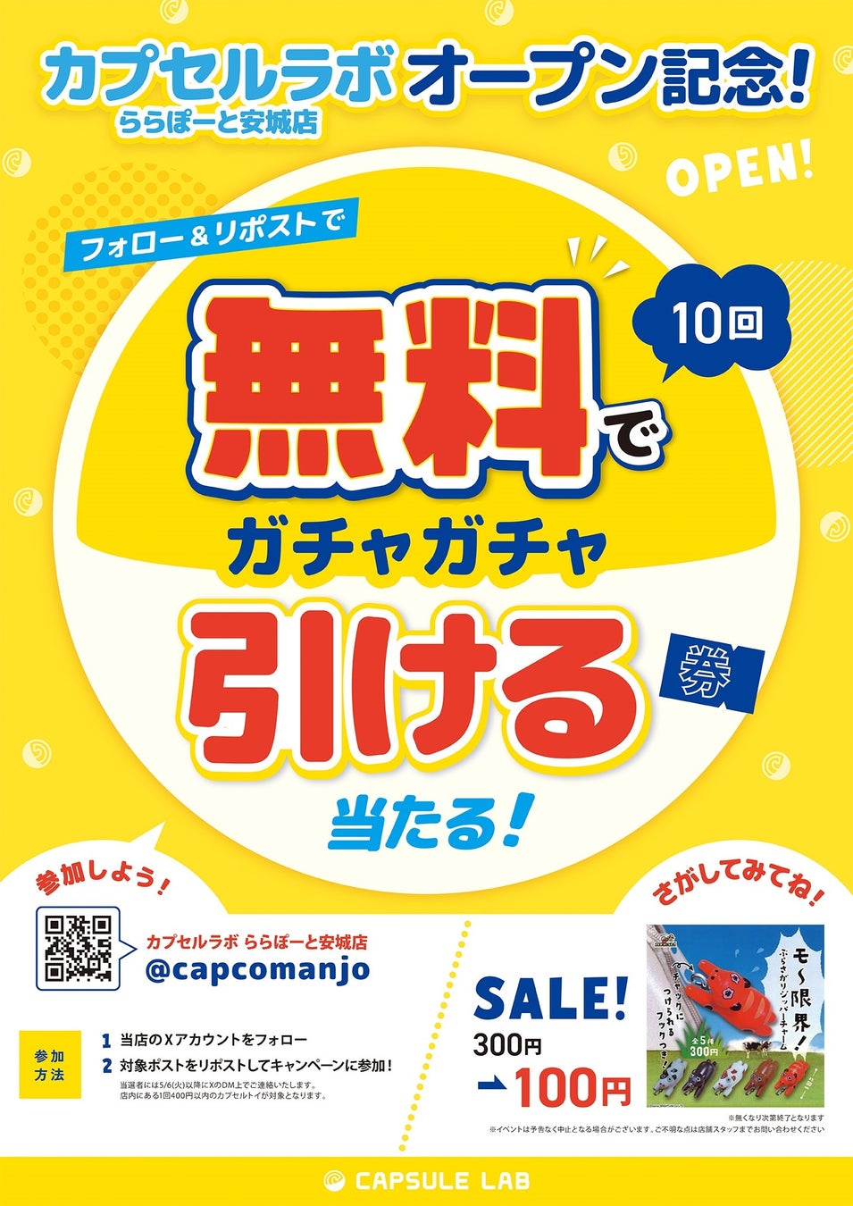 店舗公式Xアカウント(@Capcomanjo)をフォローし、該当ポストをリポストいただくことで、「カプセルラボ ららぽーと安城」店内のカプセルトイを無料で10回引いていただける券を、抽選で1名様にプレゼントいたします。