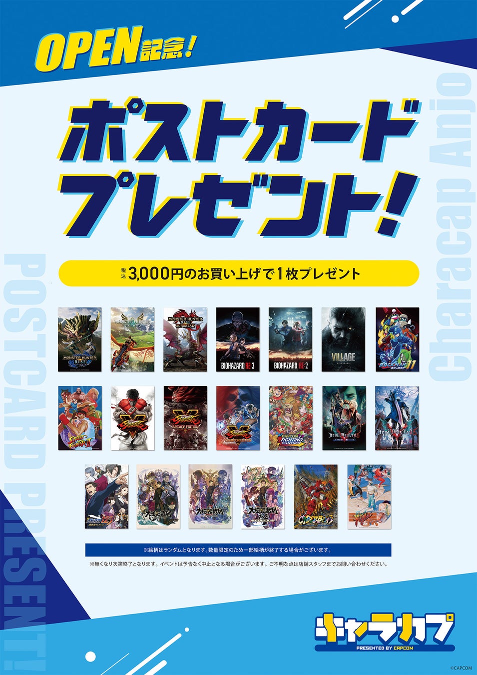 期間中、キャラカプ店内商品を税込3,000円以上ご購入いただくと、カプコンキャラクターの描かれたポストカードをランダムで1枚プレゼントいたします。