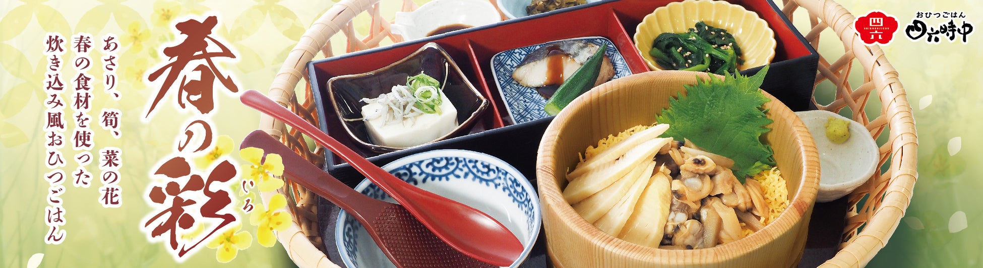 イオンイーハートは食を通じて季節を感じていただける、こだわりの旬素材を取り入れた季節限定メニューを展開しています。この度、『おひつごはん四六時中』では、春の味覚「あさり」と「筍」をトッピングした炊き込みごはん風のおひつごはんに「菜の花」、「鰆」、「しらす」を副菜に加えた春の彩りを一度に楽しめる花籠をご用意しました。メインのおひつごはんは、旨味がぎゅっと詰まった「あさり」とやわらかく苦味が少ない「穂先筍」、香り豊かなごぼうの相性が抜群、それぞれの素材が織りなす旨味と香りを存分に味わえる一品となっております。締めは当店自慢の“特製だし”でだし茶漬けとしてお愉しみいただけます。春を彩る旬素材の味わいをこの機会にご満喫いただければと考えております。