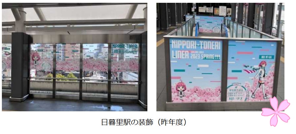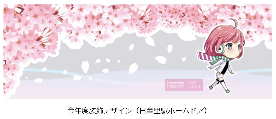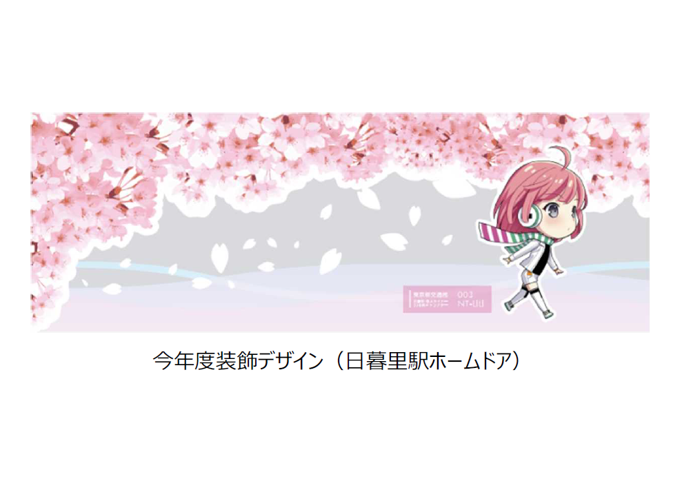 東京都交通局では、桜の花が見ごろになる時期に合わせ、日暮里・舎人ライナー4駅(日暮里駅・西日暮里駅・熊野前駅・舎人公園駅)で、日暮里・舎人ライナーの擬人化キャラクター「NT-リリ」を用いた、春をイメージしたラッピング装飾を実施します。いつもと違う華やかな駅の雰囲気をお楽しみください。