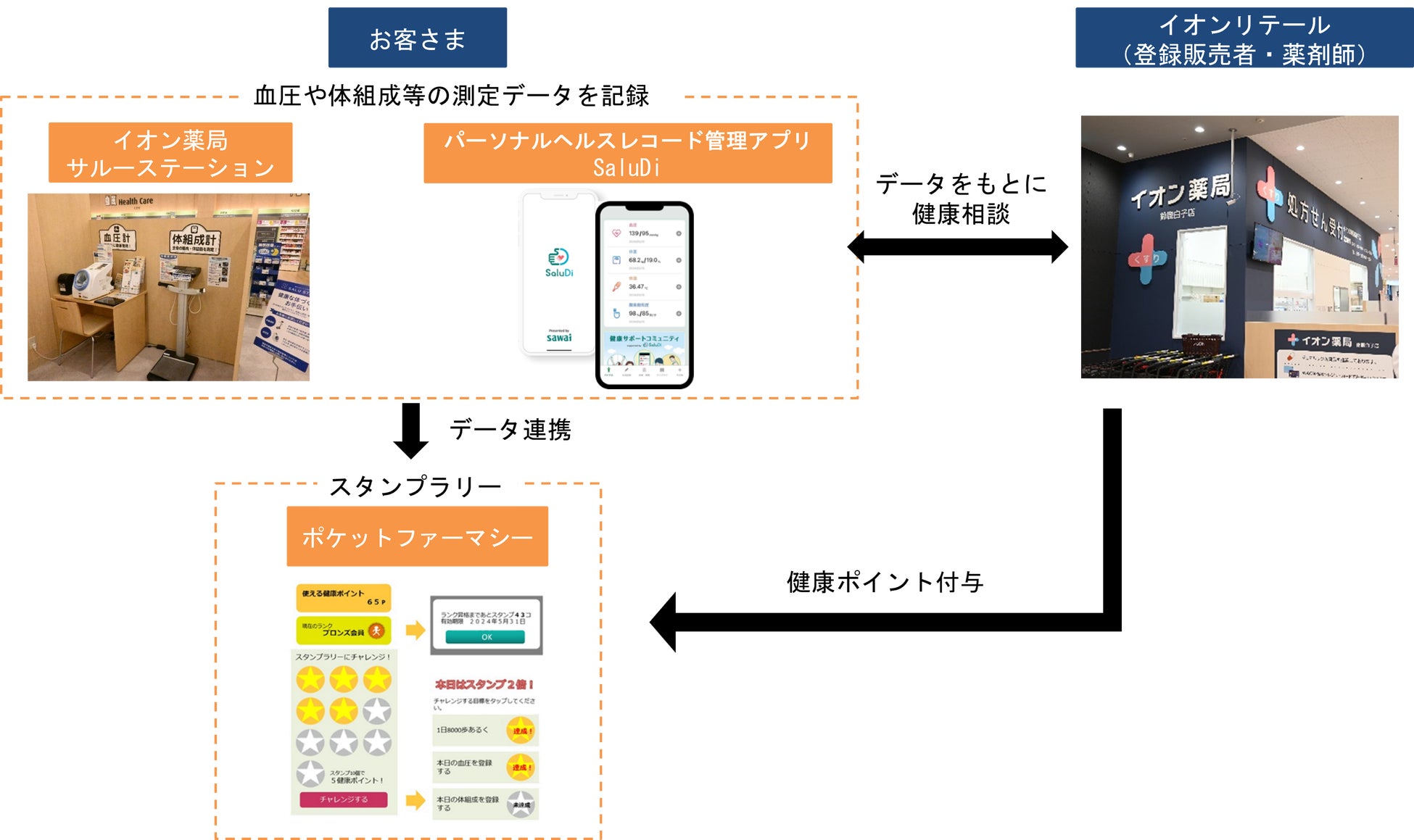 ※3:お客さまの身体の状態をセルフチェックできるイオン薬局のサルーステーションでの測定のほか、「SaluDi」と連携している機器での測定、手入力された血圧記録が対象となります。