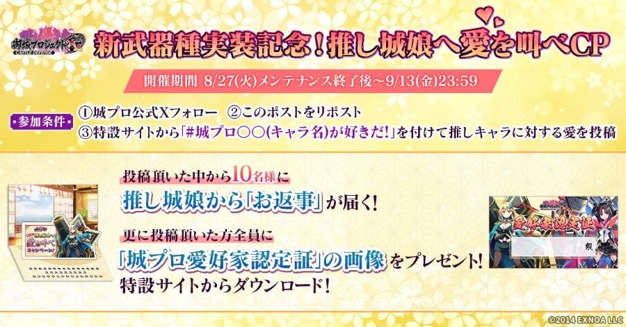 特設サイトから「推し城娘への愛」を書いてXへ投稿いただいくと、お名前入りの「城プロ愛好家 認定証」の画像をプレゼント!