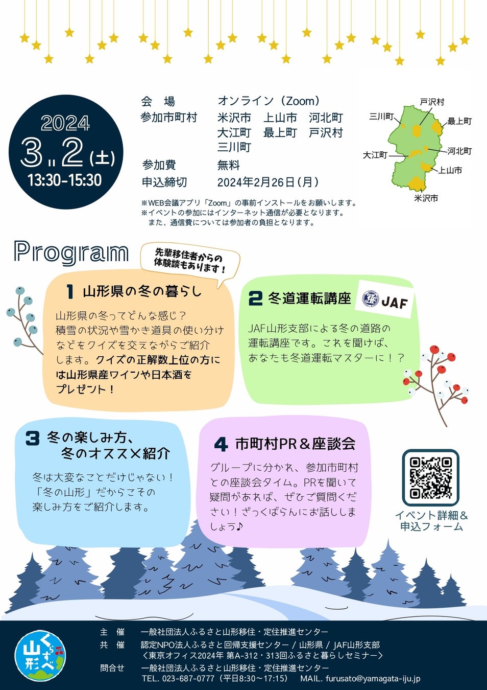 本セミナーは、一般社団法人ふるさと山形移住・定住推進センターが開催するもので、「冬の山形」の暮らしをリアルに紹介し、山形県への移住を検討されている方に「山形県の冬の暮らし」についてより具体的にイメージしてもらうことを目的としてオンラインで開催されます。