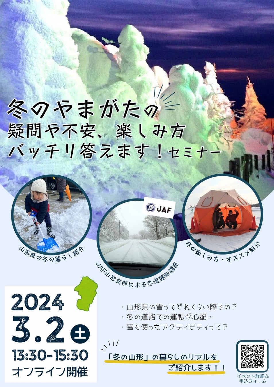 JAF(一般社団法人日本自動車連盟)山形支部(支部長 髙橋 修)は、3月2日(土)にオンラインで開催される、一般社団法人ふるさと山形移住・定住推進センター主催の「冬のやまがたの疑問や不安、楽しみ方 バッチリ答えます!セミナー」に冬道運転講座の講師として協力します。