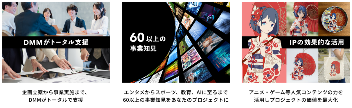DMM.comが持つ多様なIP(知的財産)を地域資源と掛け合わせ、新たな付加価値を創出します。 -