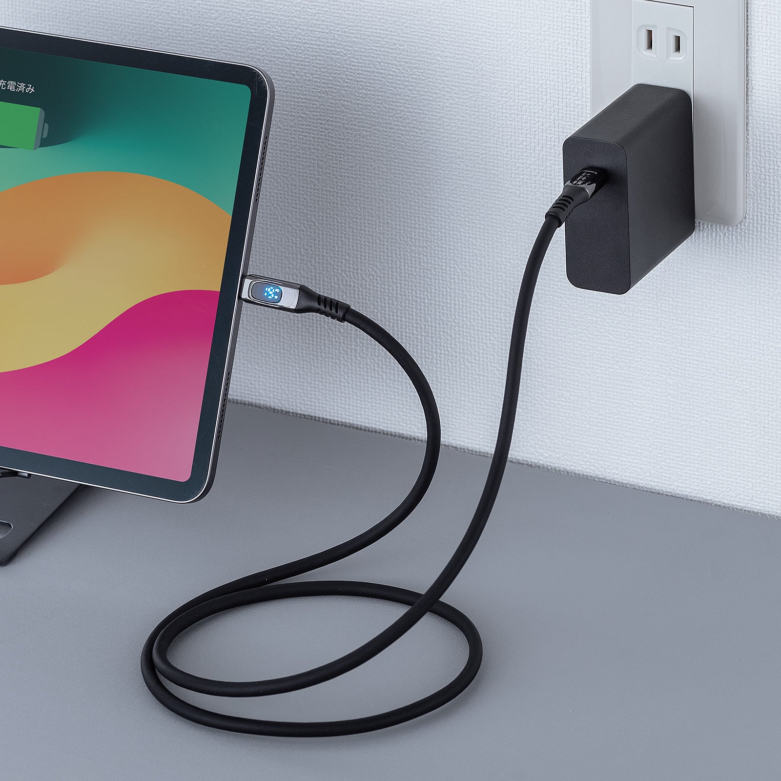 ケーブルに電力表示が付いているため、機器が問題なく充電されているかの確認にも使えます。また、急速充電(PD)や映像出力などType-Cの機器であれば、どんな場面でもこのケーブル1本で補えます。