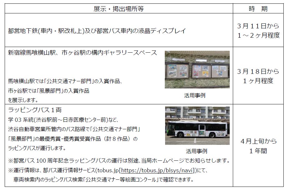 3月11日から都営地下鉄(浅草線、三田線、新宿線、大江戸線)各駅等で入賞作品をポスターにして掲出します。また、都営交通最優秀賞ほか入賞した一部の作品を3月下旬に発行する「都営交通マナーブック」(都内小学4年生向け。約13万部発行)に掲載します。