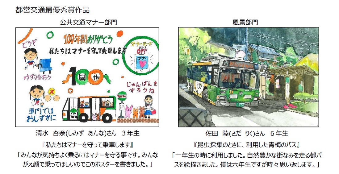入賞作品は、3月11日から順次、都営地下鉄、都営バスの液晶ディスプレイでの放映やラッピングバスの運行を行います。この他、作品は公共交通利用時のマナー啓発等に活用させていただきます。