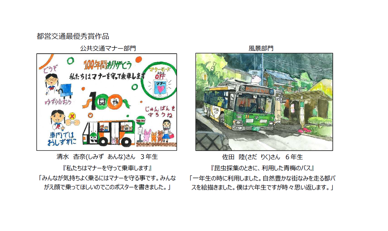 また、これらの作品をより多くの皆様にご覧いただけるよう、3月11日から都営地下鉄や都営バスなどで作品展示を行います。たくさんのご応募ありがとうございました。