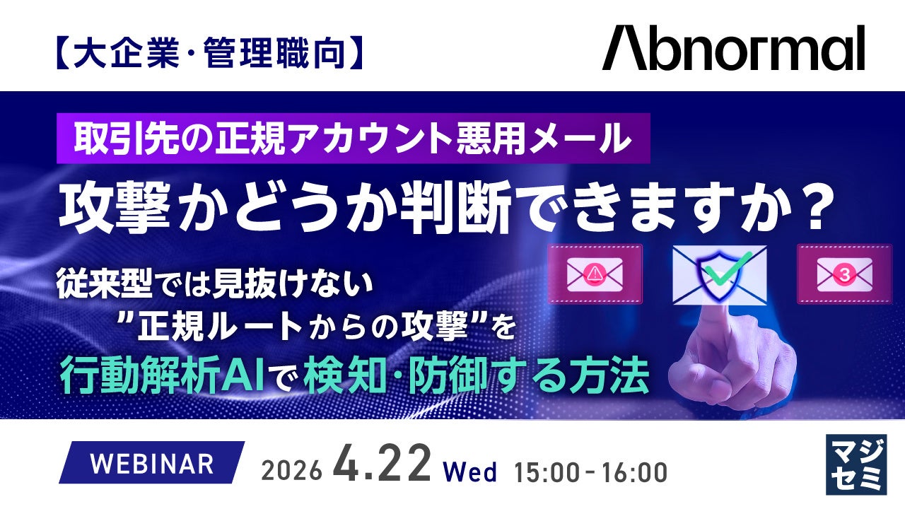 マジセミ株式会社は「【大企業・管理職向】取引先の正規アカウント悪用メール、攻撃かどうか判断できますか?」というテーマのウェビナーを開催します。