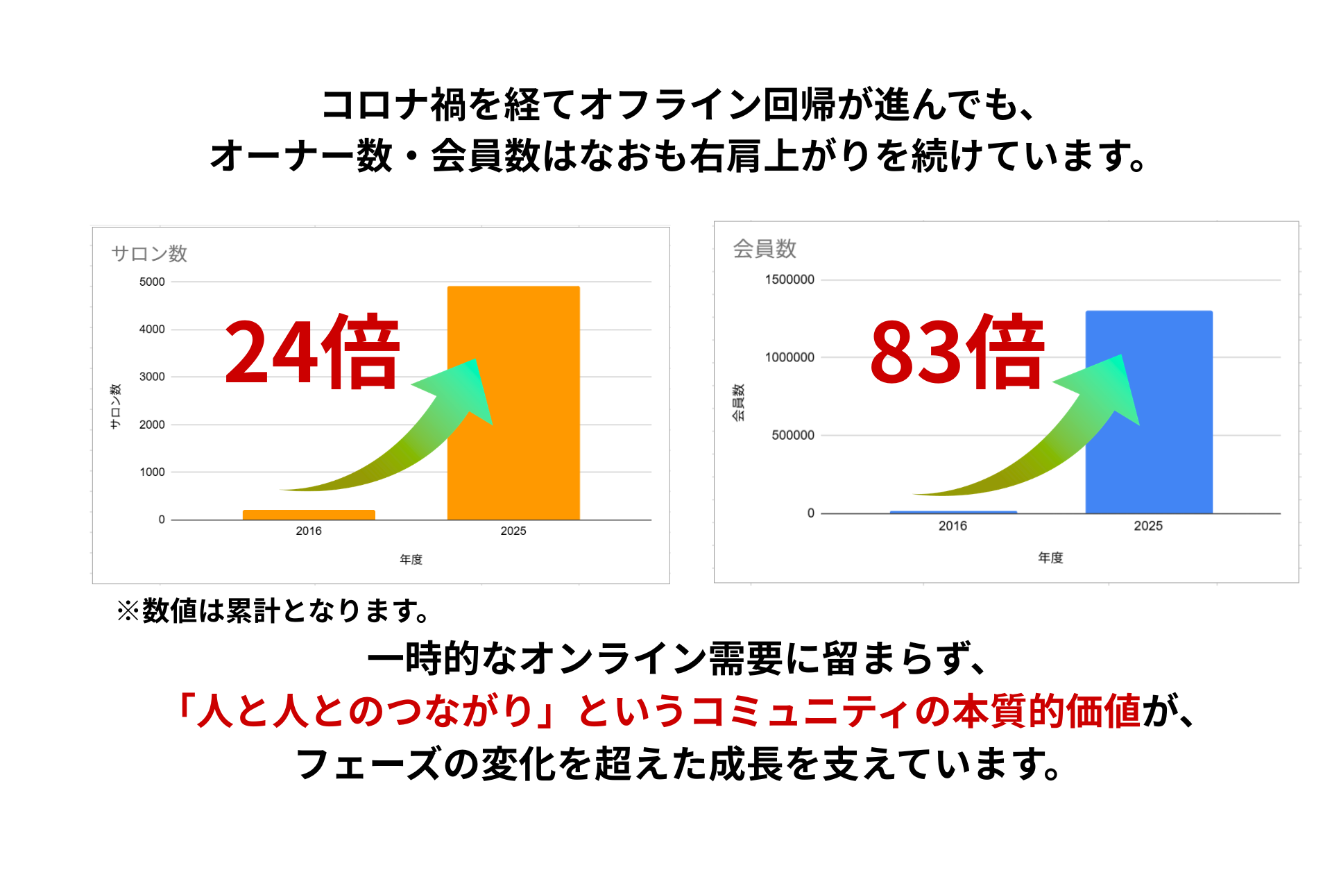 2016年のサービス開始時と比較し、会員数は約83倍、開設サロン数は約24倍へと急拡大いたしました。2020年〜2021年のパンデミック期には、隔離された環境下でも「学べる・繋がれる場所」として需要が急増。コロナ禍を経た2022年以降も会員数は右肩上がりで推移しています。コロナ禍を経ても、伸び続けた要因としては、オンラインサロンの本質は「人と人との繋がり」だからという点があります。
