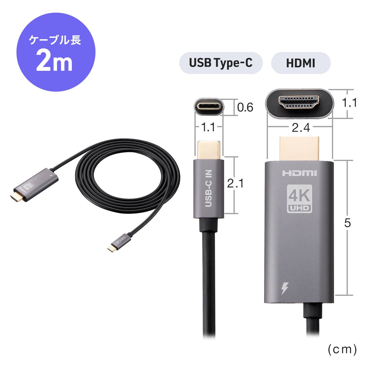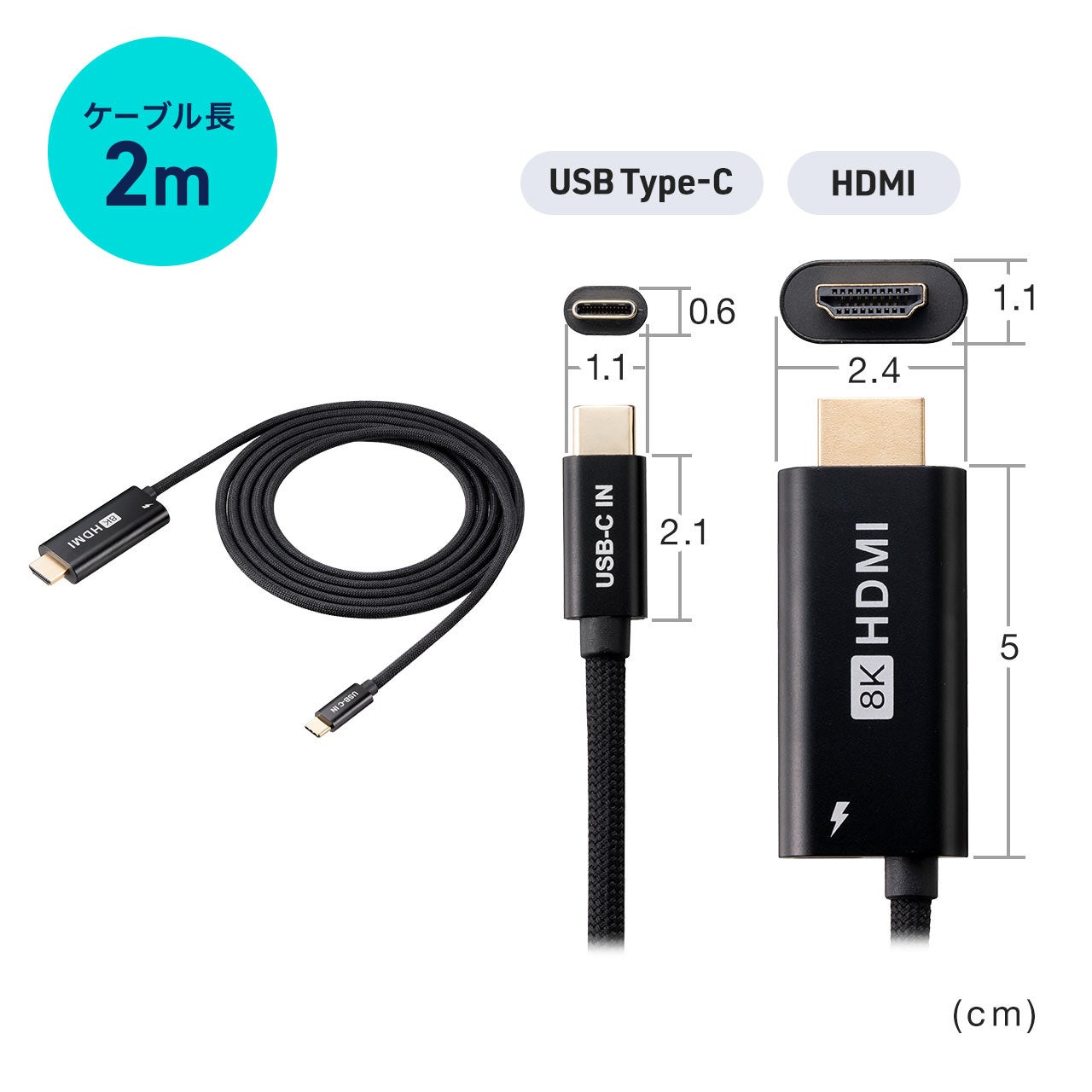 ・USB Type-C HDMI変換アダプタ 8K/30Hz 4K/60Hz PD100W ケーブル長2m typeC機器対応