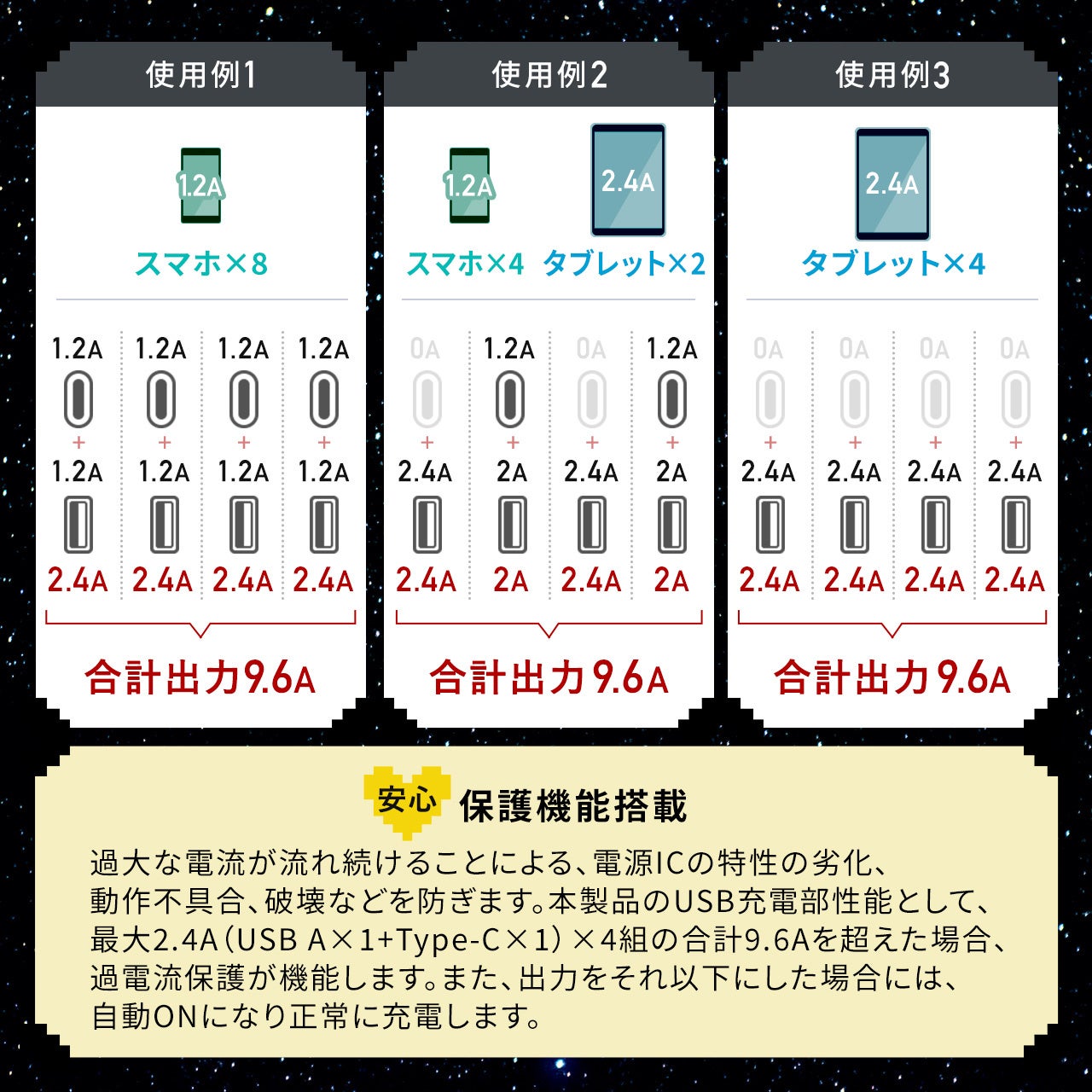 8ポートのUSB充電機能を備えており、Type-CとUSB-Aポートがそれぞれ4つずつ搭載されています。接続されたスマホやiphoneなどの機器をを自動的に検知して、その機器に最適な電源で充電を行うことができます。