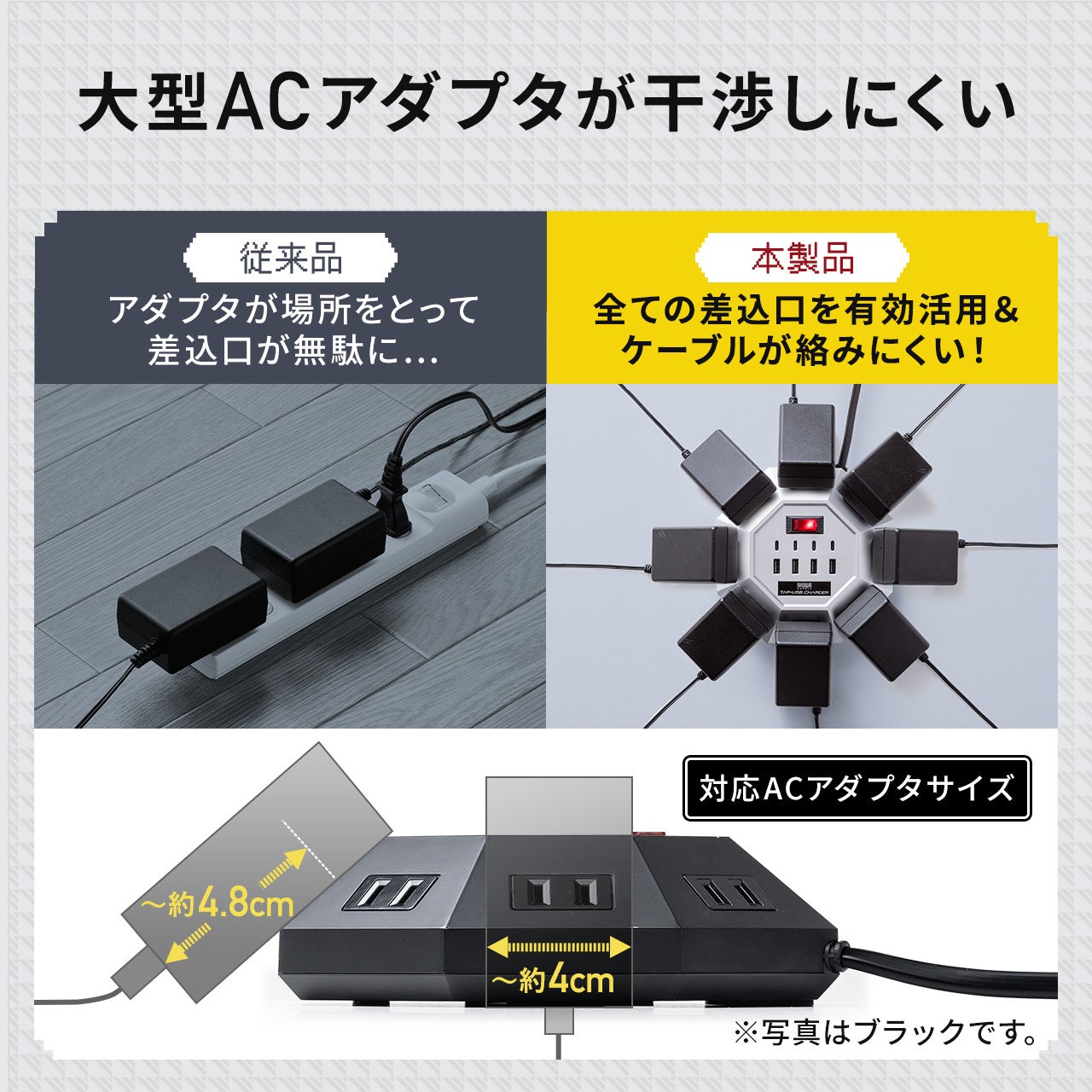 電源タップ USB充電付 クランプ固定 8個口 八角形 Type-C対応 ケーブル3m ブラック