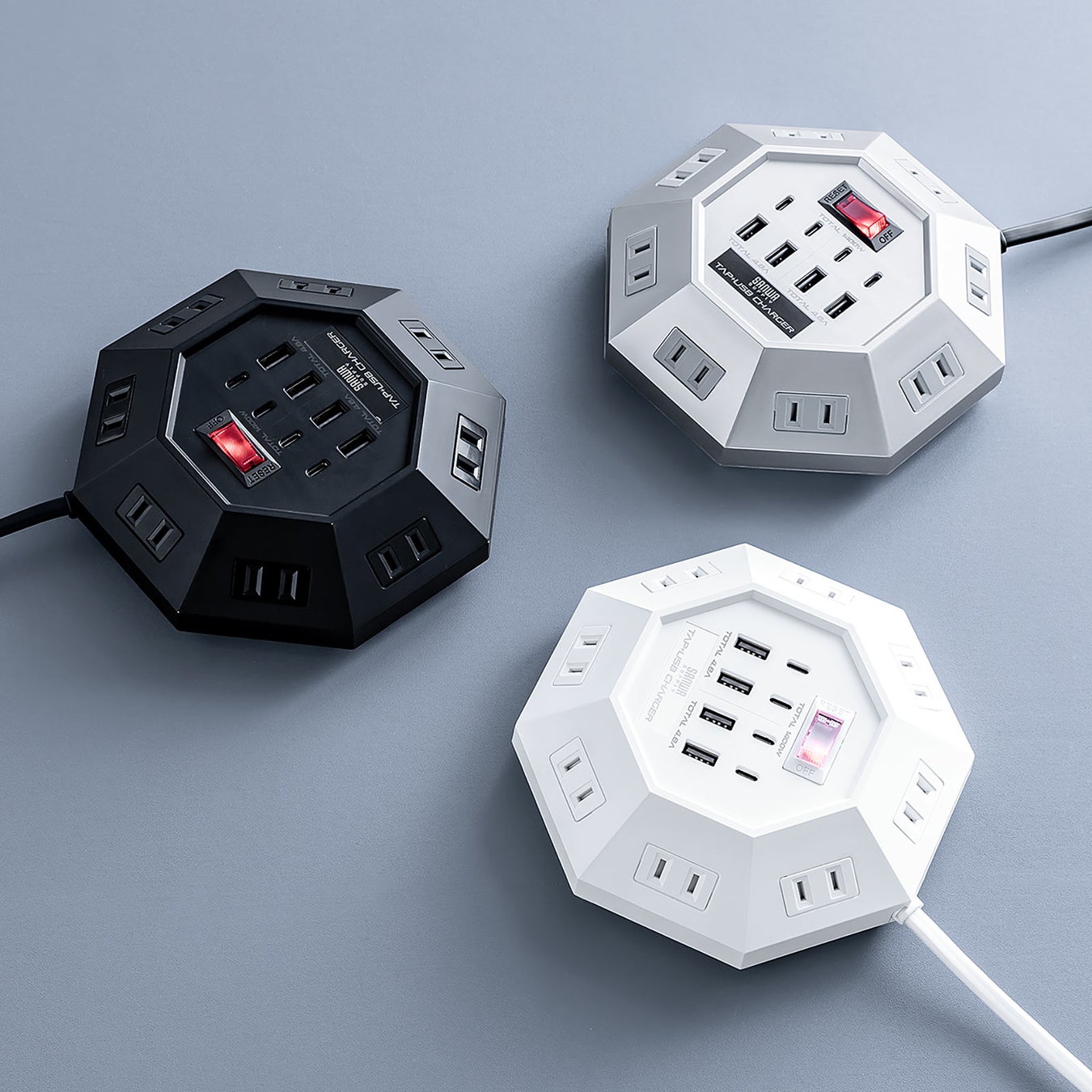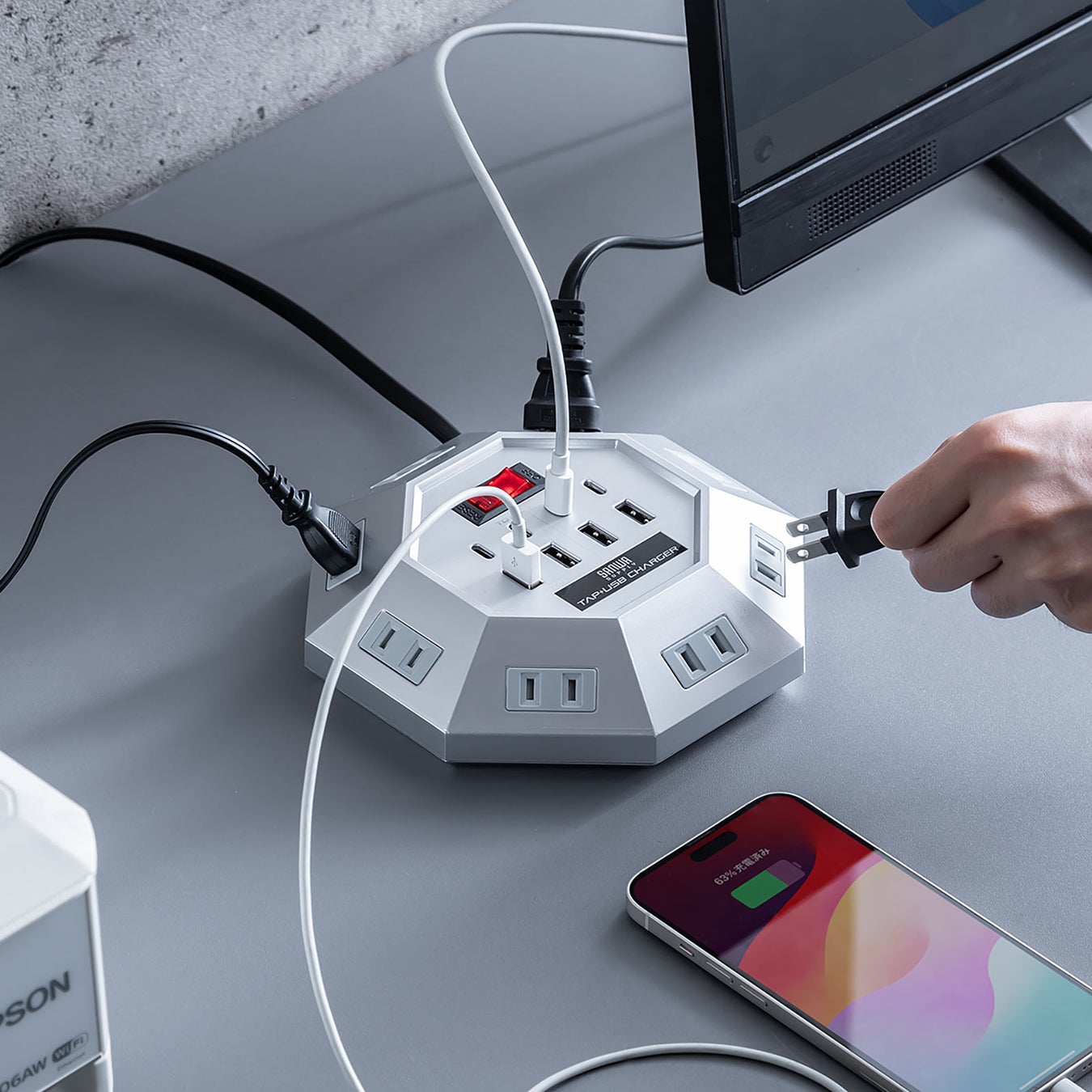 八角形のデザインで、どの方向からでも差し込むことができます。ACアダプタが干渉しにくい設計のため、全ての差込口を有効活用でき、ケーブルが絡む心配もありません。