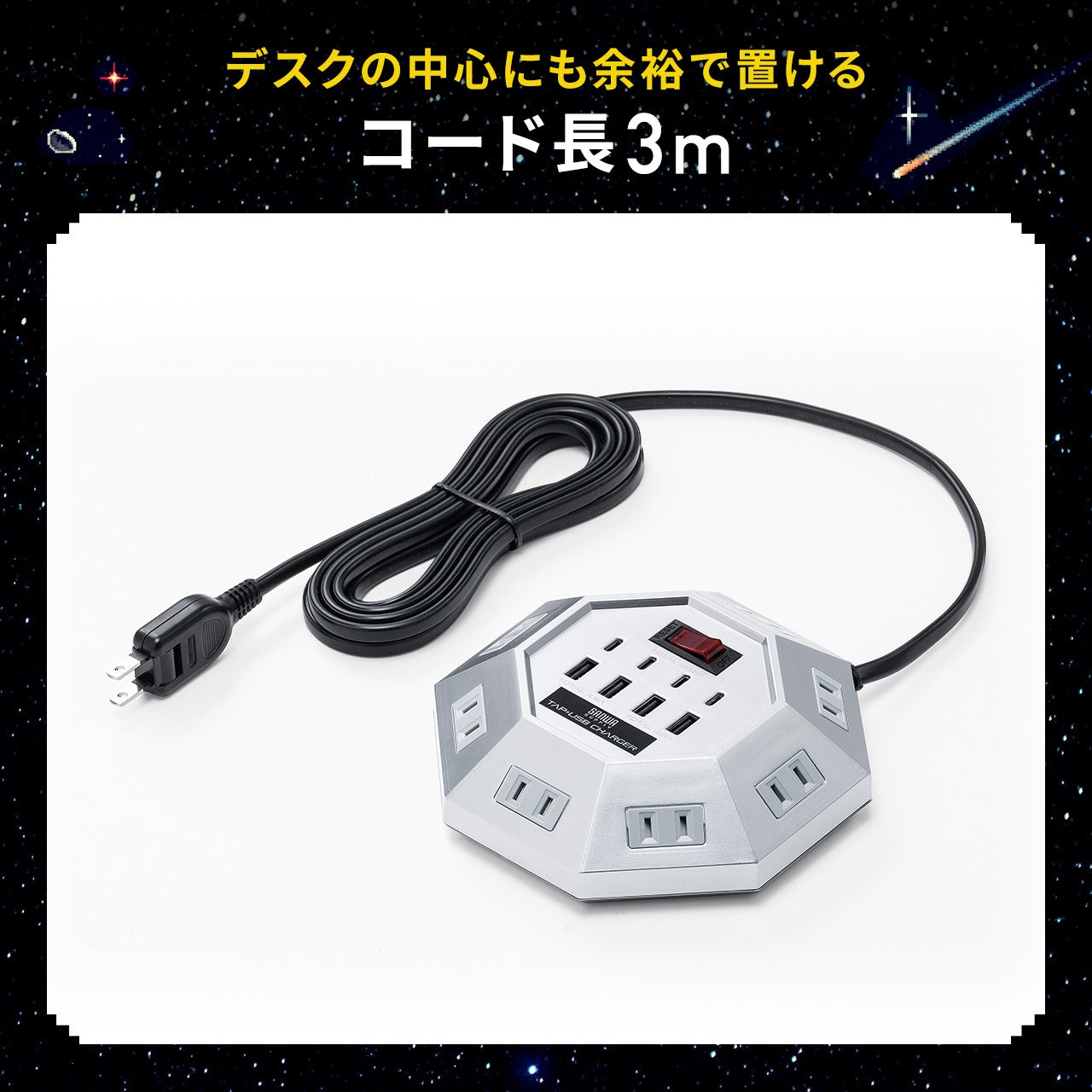 電源タップ USB充電付 クランプ固定 8個口 八角形 Type-C対応 ケーブル3m シルバー