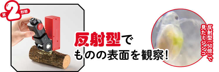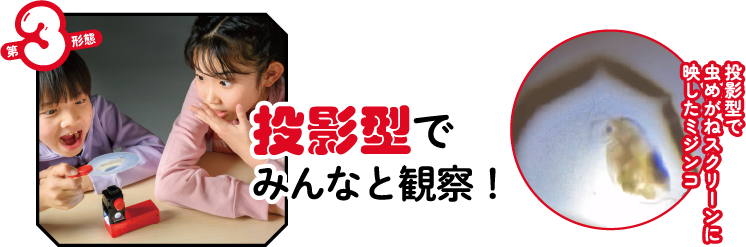 透過、反射、投影の3種類の使い方ができる顕微鏡。虫めがねスクリーンに投影すれば、みんなでいっしょに観察ができます!
