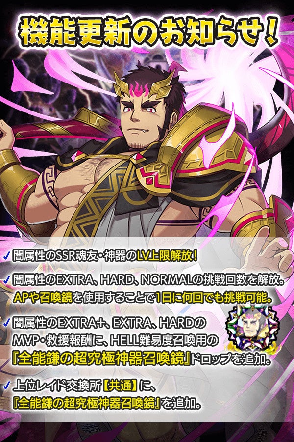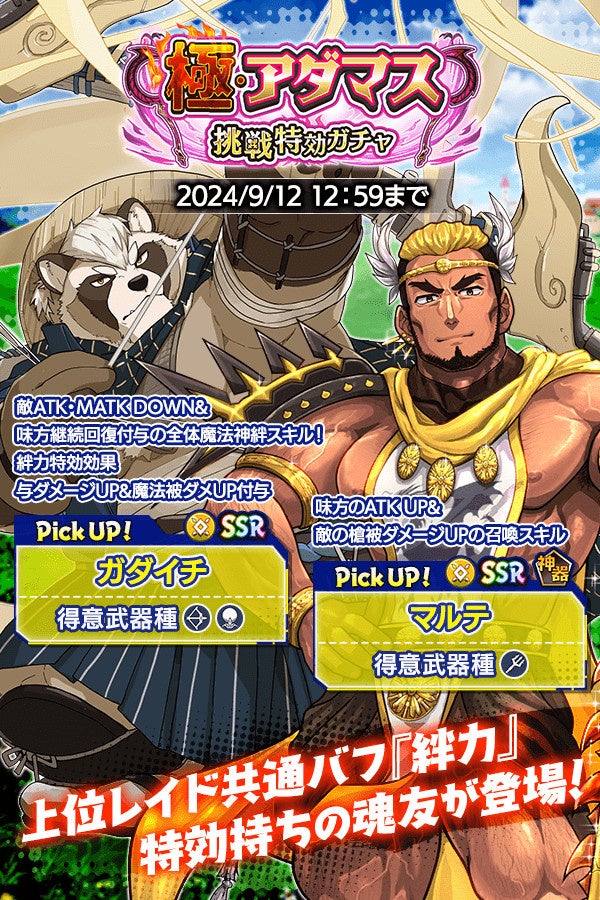 登場するキャラクターはHELLのレイド攻略に有効な特効スキル持ち。SSR魂友「ガダイチ」とSSR神器「マルテ」がピックアップされた「極・アダマス挑戦特効ガチャ」をお見逃しなく。