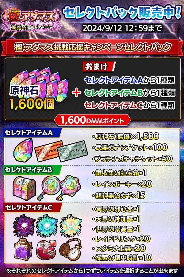 原神石に加えて、ガチャチケットや限界突破アイテムなど、お好きなアイテムを選択できる「極・アダマス挑戦応援キャンペーンセレクトパック」が登場!
