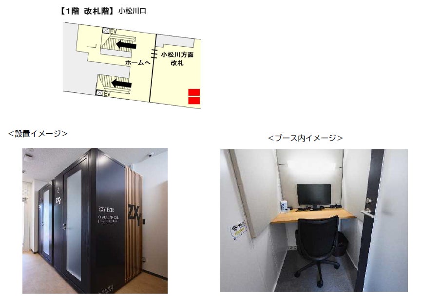 ビジネスエリアの日比谷駅、六本木駅には「CocoDesk」(設置事業者:富士フイルムビジネスイノベーション株式会社)を、住宅地エリアの東大島駅には「ZXY BOX」(設置事業者:株式会社ザイマックス)を開設。ブース内には、電源コンセントや無線LAN、エアコン等を完備しており、外出先でも快適・安全に、テレワークやWeb会議、オンラインレッスン等がご利用いただけます。