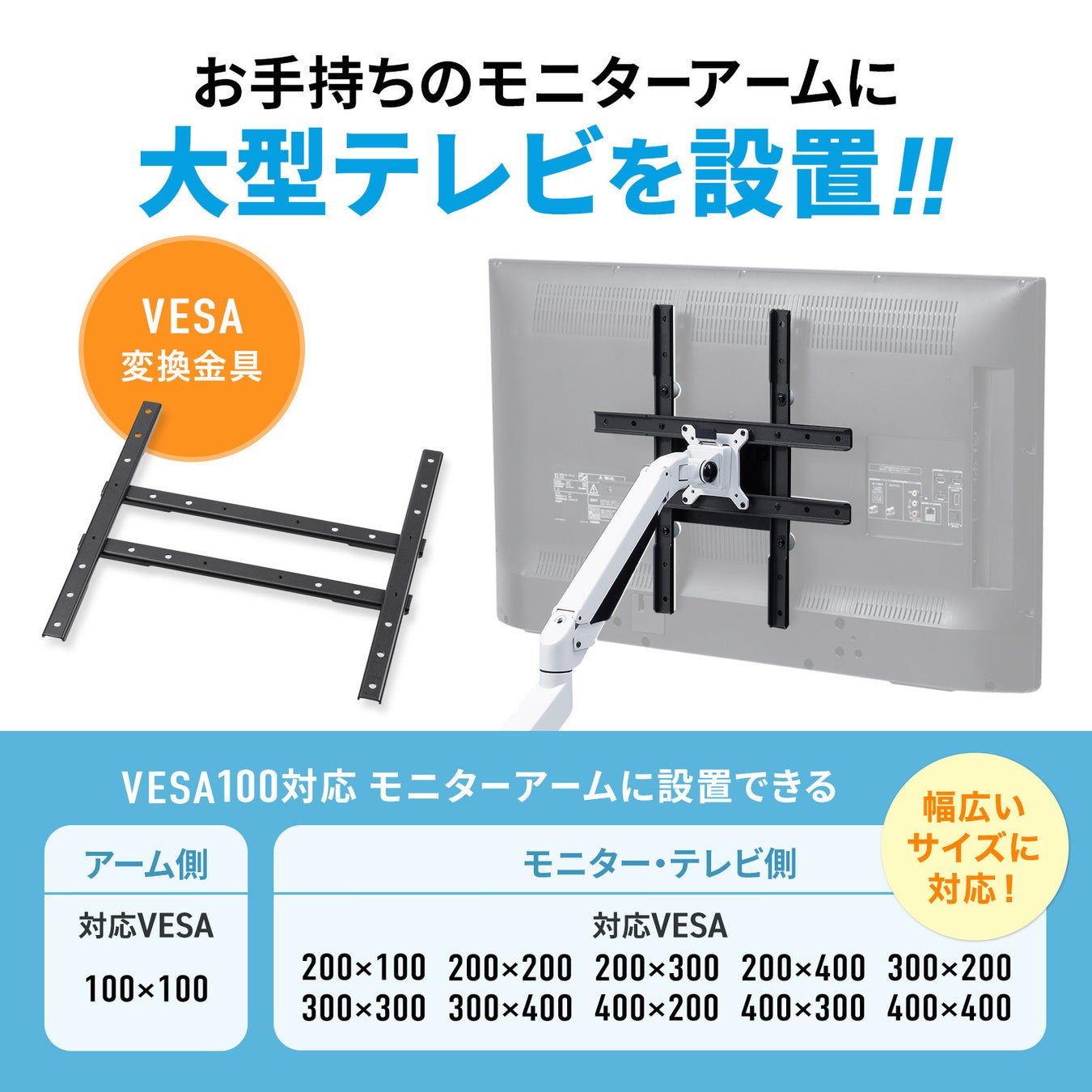 アーム側の対応VESAは100×100です。モニター・テレビ側のVESAを200×100、200×200、200×300、200×400、300×200、300×300、300×400、400×200、400×300、400×400へ変換できます。
