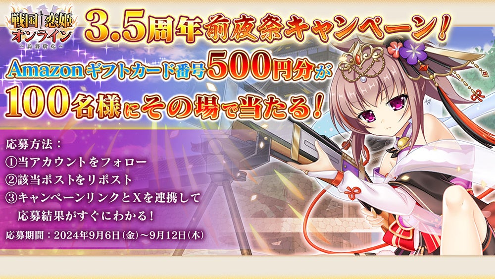 < 戦国†恋姫オンライン ~奥宴新史~ >Xをフォロー&リポストで最大100名様にAmazon ギフトカード番号が当たる!3.5周年前夜祭キャンペーン開催中