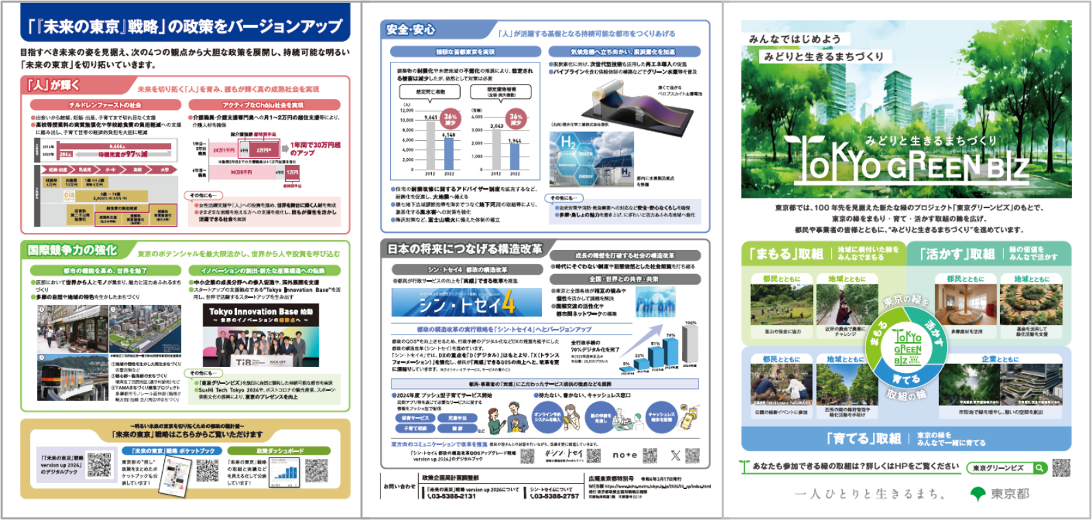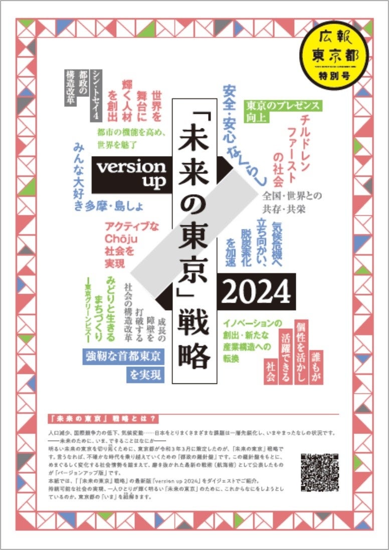 東京都は、令和3年3月に策定した「『未来の東京』戦略」の政策をバージョンアップし、「『未来の東京』戦略 version up 2024 」として公表しました。バージョンアップした「『未来の東京』戦略」の4つの政策強化のポイントをダイジェストでまとめ、広報東京都特別号として発行いたします。持続可能な社会の実現、一人ひとりが輝く明るい「未来の東京」のために、これから東京都がなにをしようとしているのかをご確認ください。