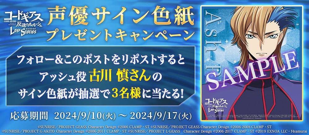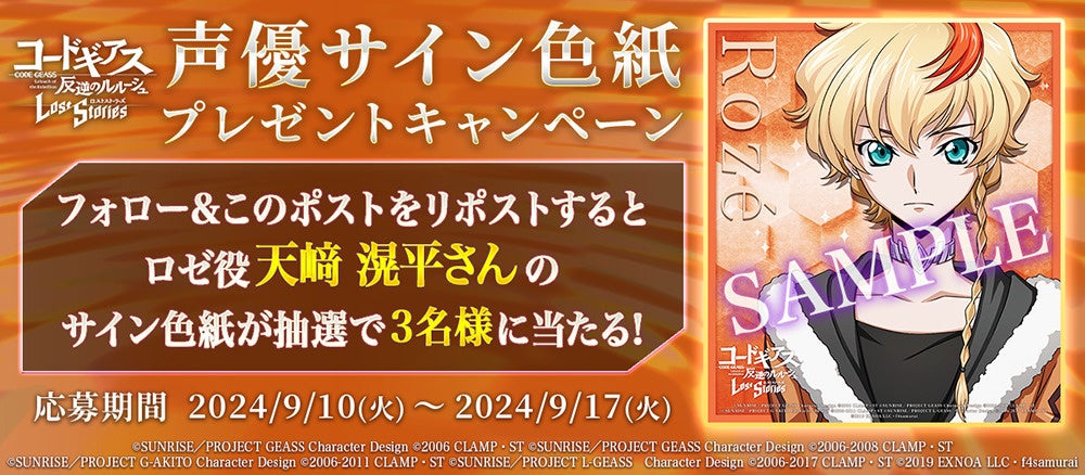 「コードギアス 奪還のロゼ」コラボを記念し、ロゼ役の天﨑滉平さん、アッシュ役の古川慎さん、サクヤ役の上田麗奈さんのサイン色紙キャンペーンを開催!