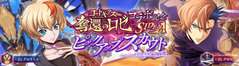 「『コードギアス 奪還のロゼ』 コラボ記念 ピックアップスカウト SIDE : A」では新パイロット、★4ロゼ[奪還する覚悟]、★4アッシュ[ナナシの傭兵] が、「『コードギアス 奪還のロゼ』 コラボ記念 ピックアップスカウト SIDE : B」では新パイロット★4ラズベリー[幻の従業員]が登場!