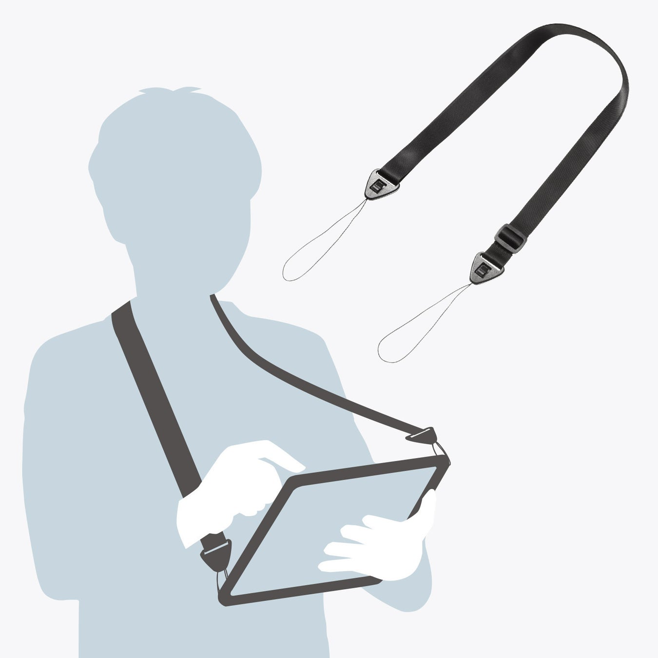 長さ73~126cmのストラップ。ケースの角にストラップホールが付いているので、縦・横どちらの向きでも使用できます。