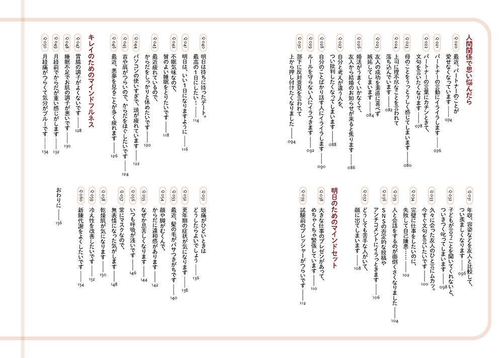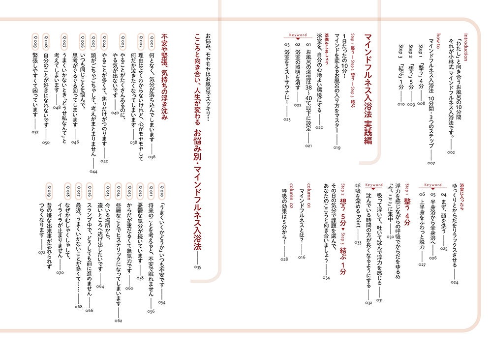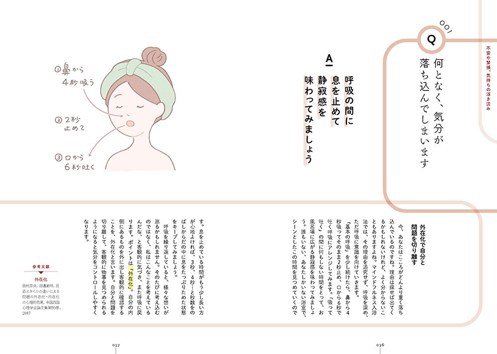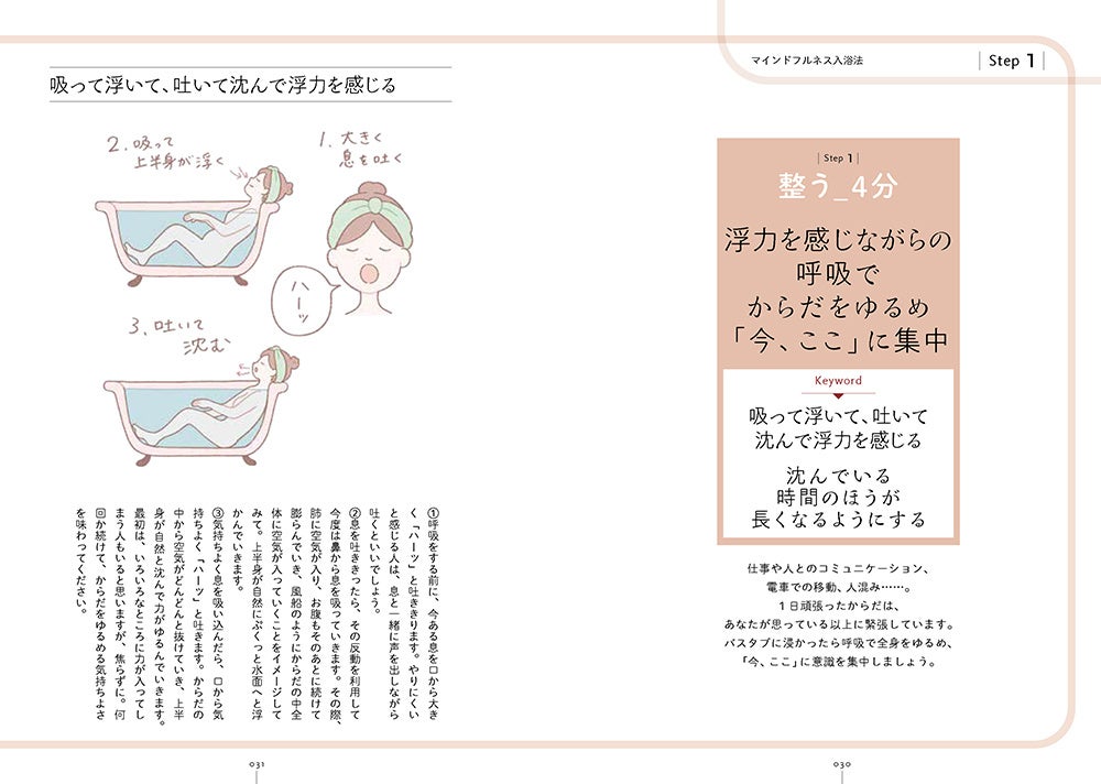 この本で紹介するマインドフルネス入浴法は、基本的なマインドフルネスをお風呂で実践しやすいように小林麻利子さんが考案したものです。大切なのはマインドフルネス同様「今、ここ」に意識を集中すること。浮力を感じながらゆっくりと呼吸だけを行って、「今、ここ」に意識を集中しながらこころを整えていきましょう。眠りの質も高められるお風呂の入り方を行いながら、心にダイレクトに向き合える様々な科学的エビデンスのある心理療法を60個、紹介しています。本文はとても読みやすく、イラストでわかりやすく解説されています。