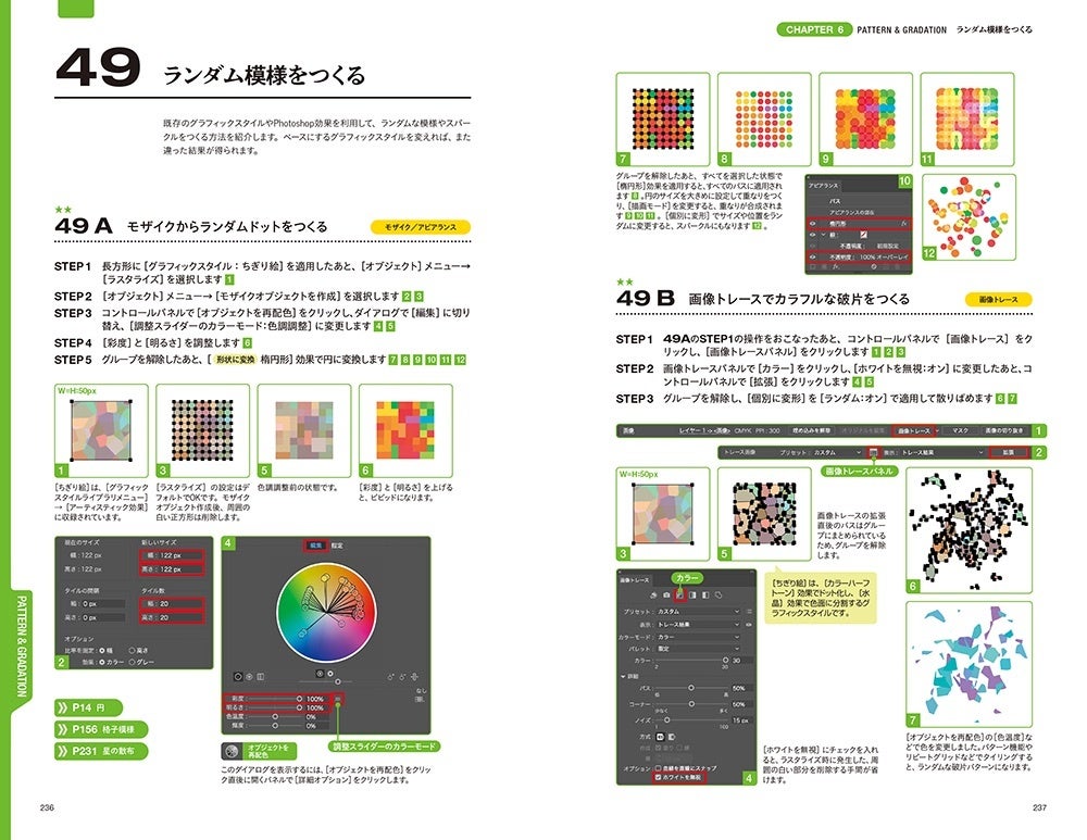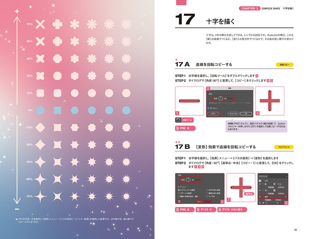 ライン、記号、図形、パターン、模様、テクスチャ、イラスト、文字加工など、Illustratorでつくりたいものが何でも載ってる「逆引きテクニック事典」。あの図形が描きたい、こんな模様がつくりたいといったイラレでやりたいことを、井上のきあ流の多彩なアプローチで解説します。