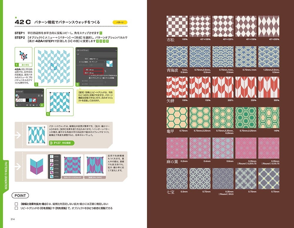 また、基本的なテクニックを使いながらデザイン・描画までたどり着けるようになっているため、Illustratorの習熟度も自然に上がっていきます。一冊丸っと読み終えたら、自分で使える素材集ができ上がっているような、二度も三度もおいしい「学習テキスト」です。