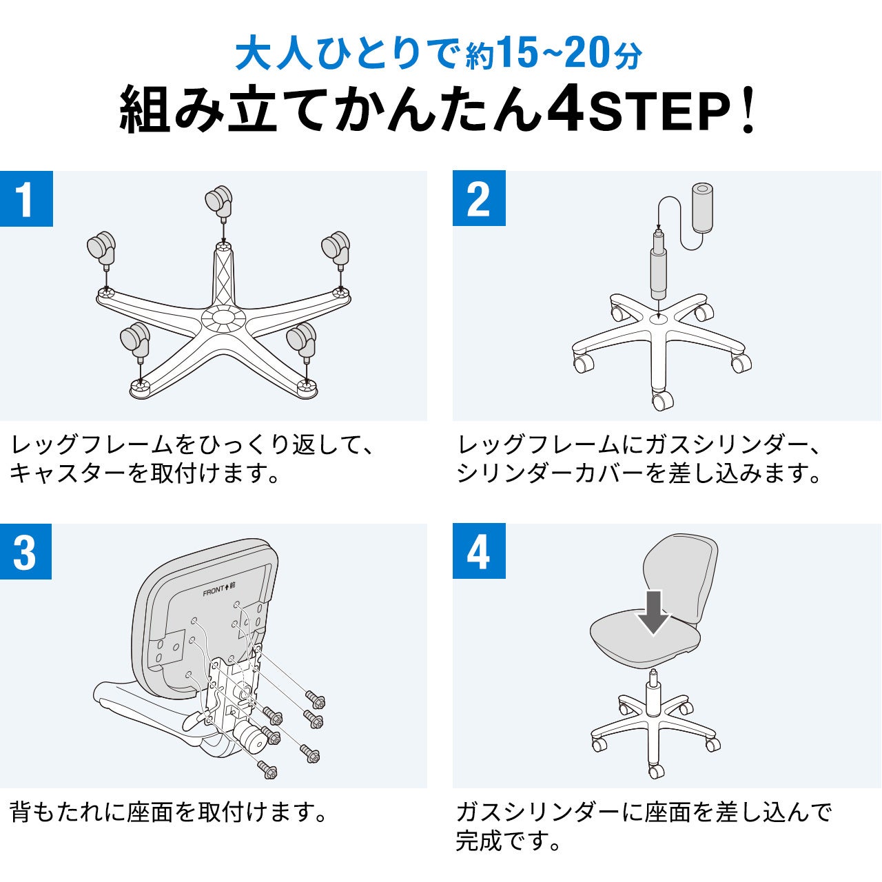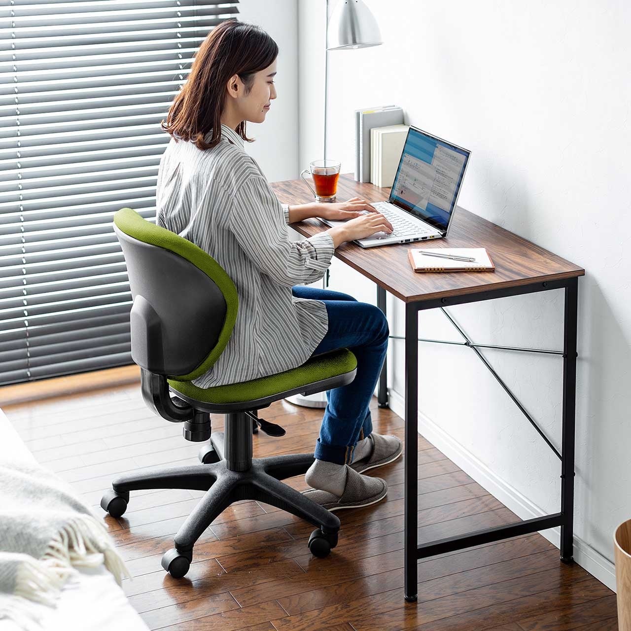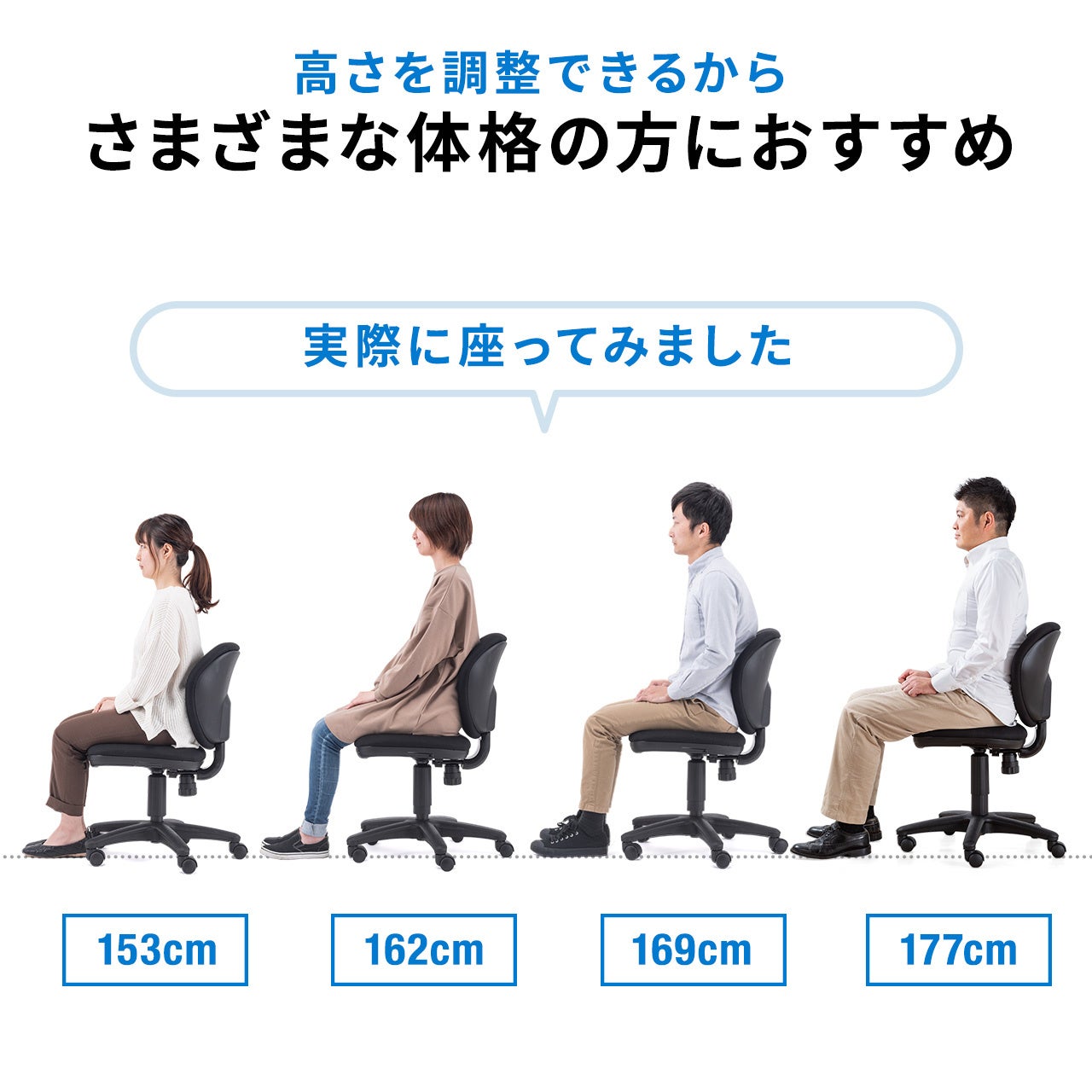 背もたれのゆるやかなカーブが背中を包みます。ガス圧リフト装置付きなので、お好みの座面の高さに調整できます。
