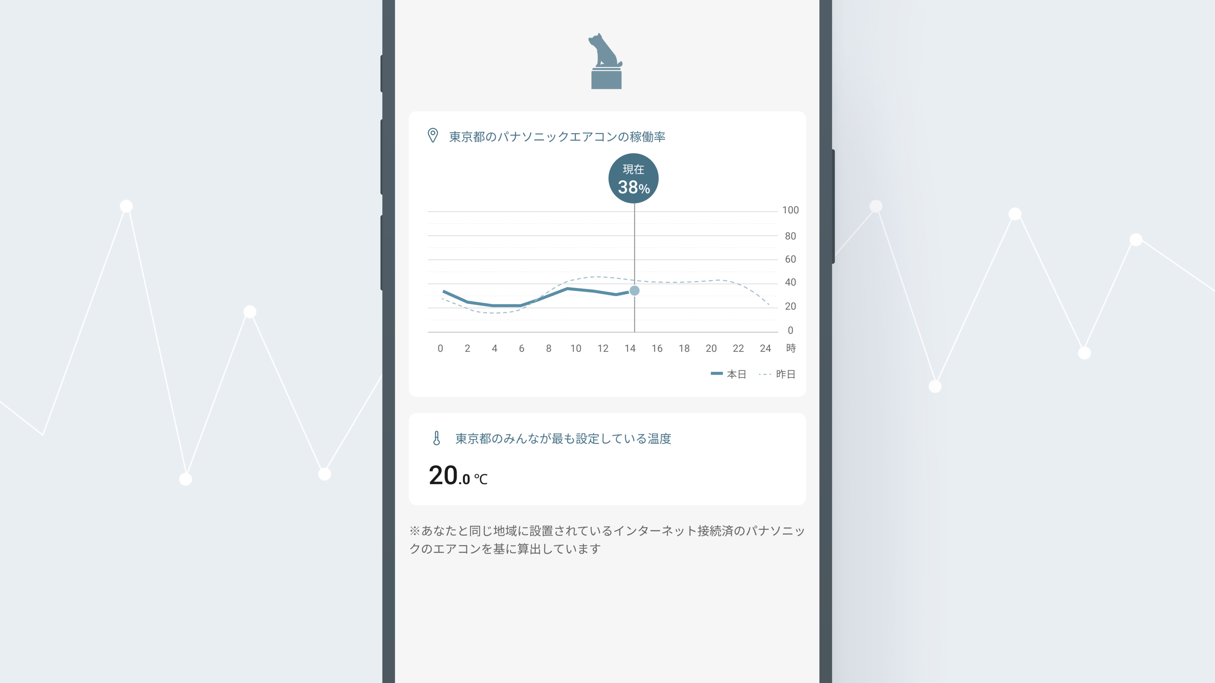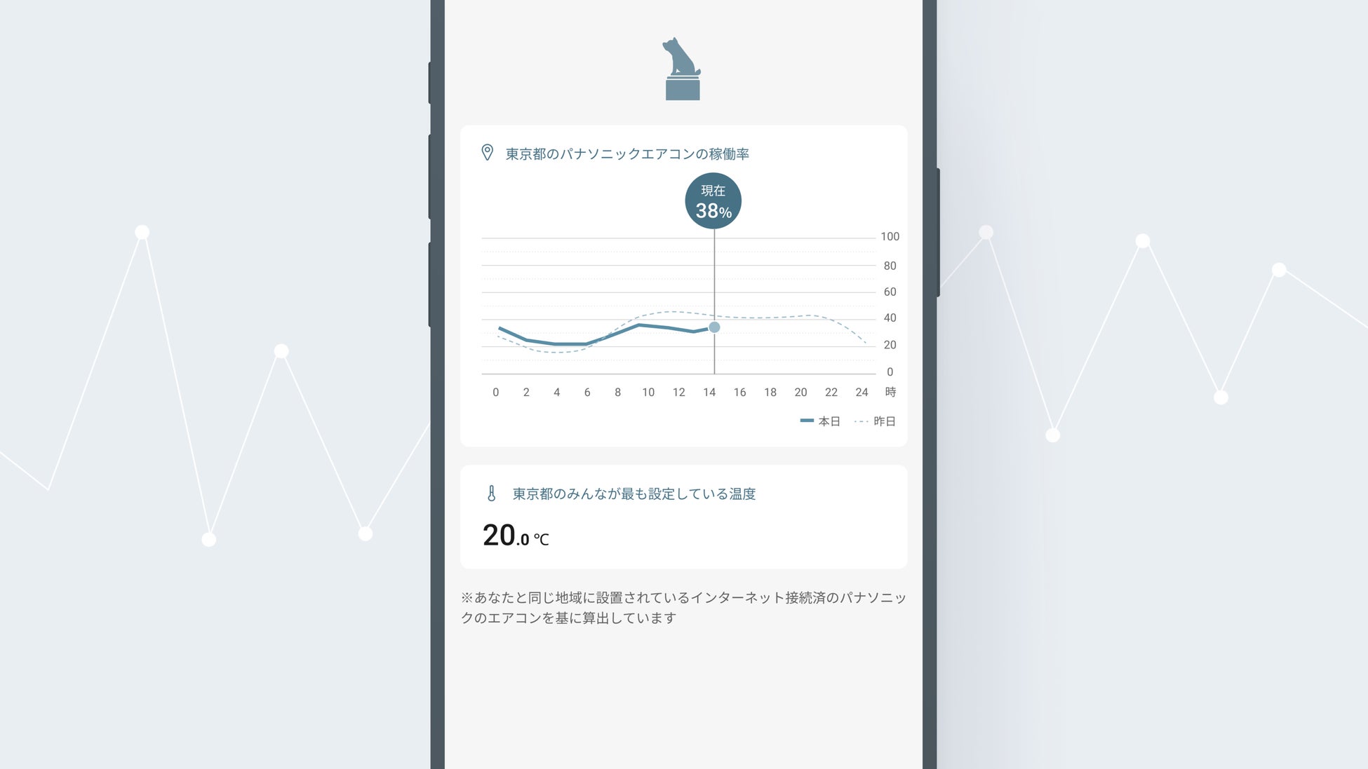 お住まいの地域に設置されている当社製エアコンの前日から現在までの稼働率と、現在最も多く設定されている温度を表示。