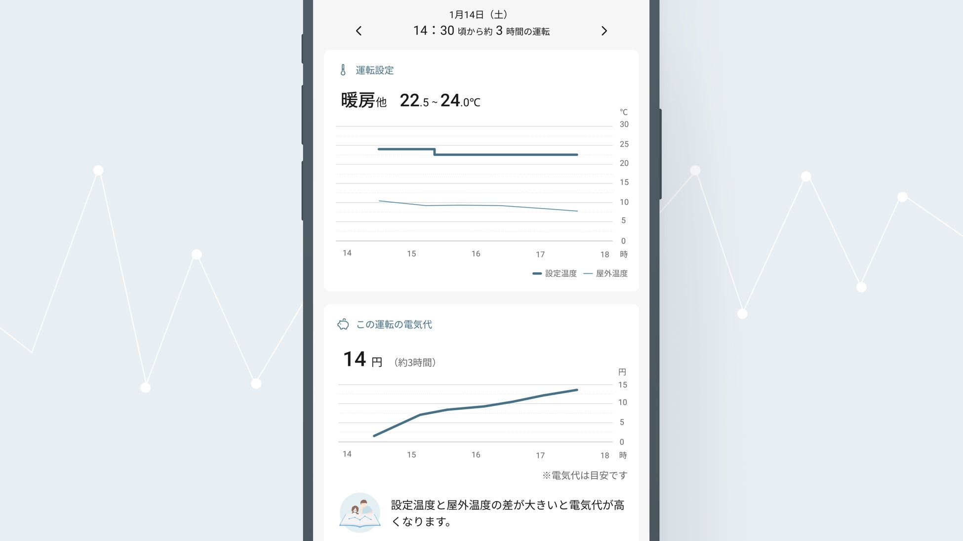 1週間分のエアコンの運転内容を表示。各運転時の運転モード、設定温度、外気温のほか、電気代をグラフで確認できるので、エアコンの使い方の見直しに役立ちます。