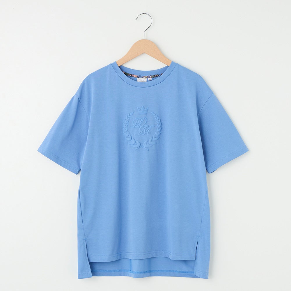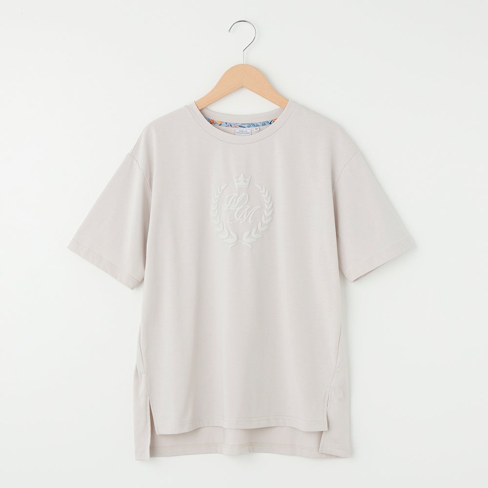 ①WMの文字をエンブレム調にデザインし、立体的な発泡プリントを施しています。体型カバーのできる前後差シルエットです。えりにウィリアム・モリスのプリントをさりげなく使用しました。