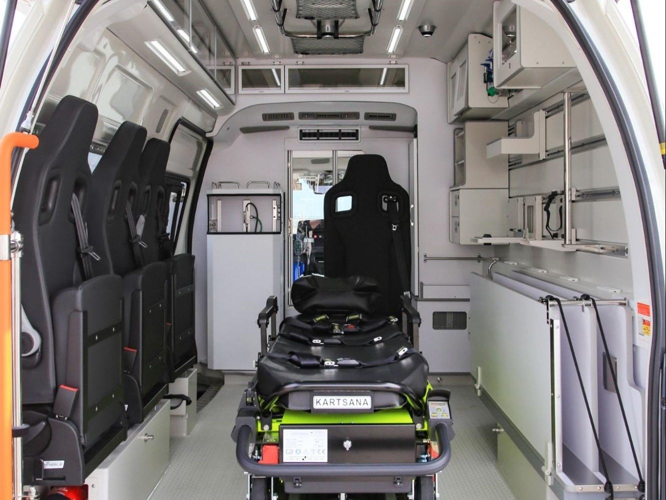 この度導入された「C-CABIN」には、電動ストレッチャー「KARTSANA」を搭載するなど、医師や看護師、救急救命士など自治医科大学附属さいたま医療センターの現場の声を形にした一台です。