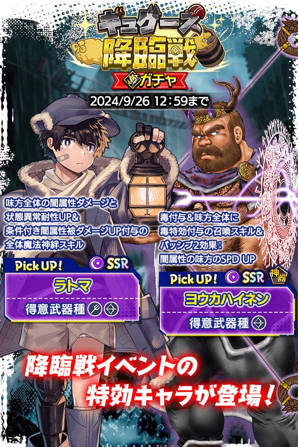 SSR魂友「ラトマ」とSSR神器「ヨウカハイネン」が入手しやすい「ギュゲース降臨戦ガチャ」をお見逃しなく。