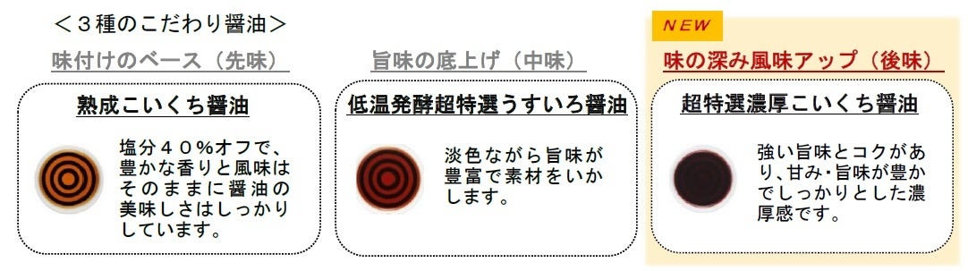 従来のたまり醤油から「超特選濃厚こいくち醤油」に変更し、醤油全体の旨味を底上げしました。3種類の醤油の甘味や香りの特長を活かし、先味、中味、後味のバランスを保ちつつ“あと引く旨味”を付与しています。