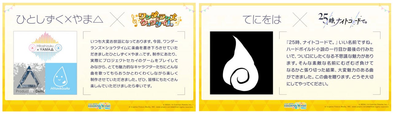 ひとしずく×やま△さんには「ワンダーランズ×ショウタイム」のユニット楽曲、てにをはさんには「25 時、ナイトコードで。」のユニット楽曲を提供いただきます。