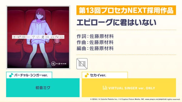 新たなリズムゲーム楽曲として、「エピローグに君はいない」(作詞・作曲:佐藤原材料)の追加が決定いたしました。本楽曲は、「一緒に作ろう!第13 回楽曲コンテストプロセカNEXT」の採用楽曲です。