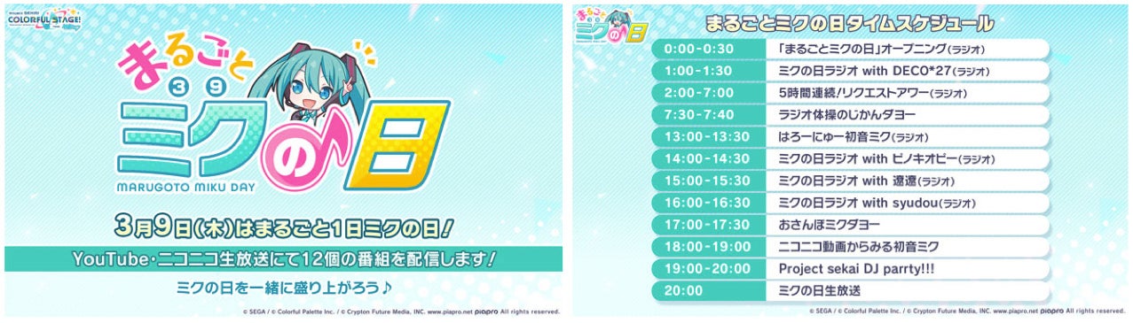 13個の企画を予定しており、深夜2 時から開始予定の「リクエストアワー」では、先日アンケートにて募集した「おすすめ初音ミク歌唱楽曲」をいただいたコメントと共にご紹介していきますので、ぜひお楽しみに!