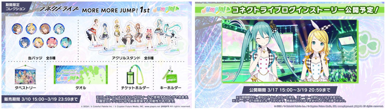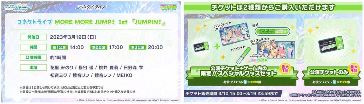 本公演は、MORE MORE JUMP!のメンバーとバーチャル・シンガーから初音ミク、鏡音リン、鏡音レン、MEIKO が出演し、MC+全曲フルサイズでお届けするバーチャルライブで、公演時間は約1 時間を予定しております。公演は、3月19日(日)中に計3回の開催を予定しています。
