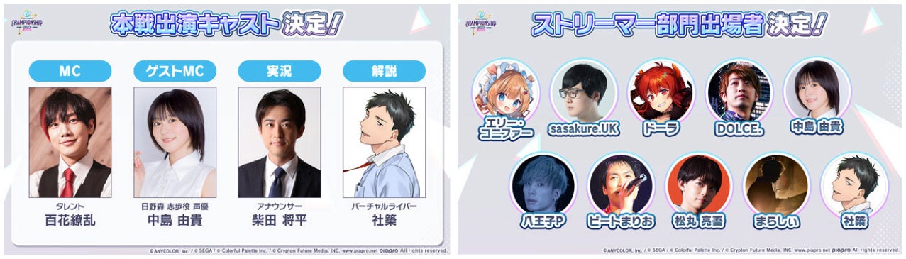 本戦の出演キャストは大会MCが百花繚乱さん、ゲストMCは中島由貴さん、実況は柴田将平さん、解説は社築さんです。また、ストリーマー部門の出場者も決定いたしました。