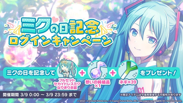 キャンペーン期間中にログインした方には、フルセット「セカイドレスミクなりきり衣装」と「想いの純結晶」×1 個、「ネギ」×39 個をプレゼントいたします。