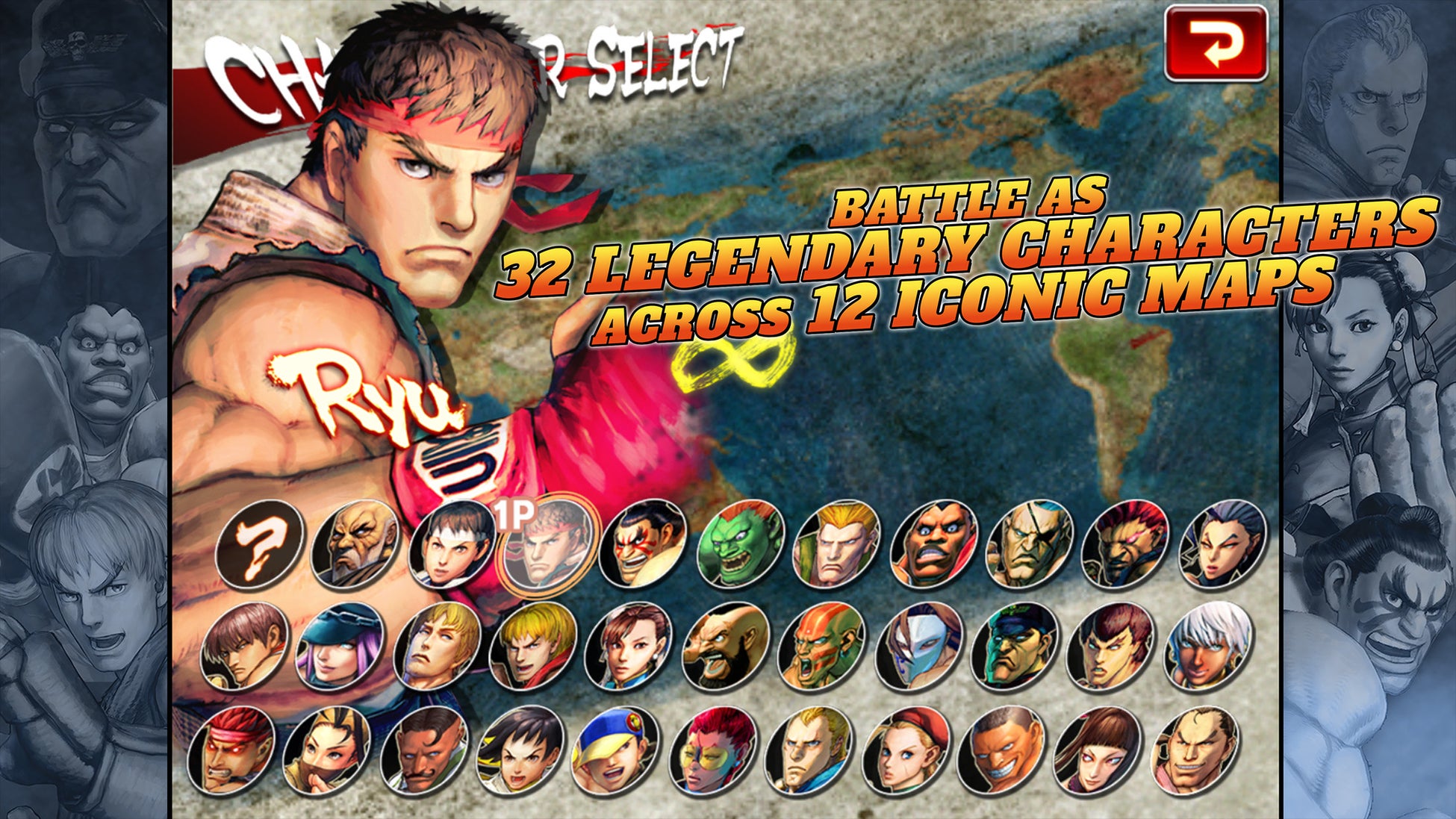 リュウ、ケン、春麗、ガイル、ブランカ、ダルシム、E.本田、ザンギエフ、ベガ、バルログ、サガット、バイソン、C.ヴァイパー、アベル、ダン、さくら、フェイロン、ローズ、キャミィ、豪鬼、剛拳、ディージェイ、ガイ、コーディー、まこと、いぶき、ダッドリー、ジュリ、ユン、殺意の波動に目覚めたリュウ、エレナ、ポイズン