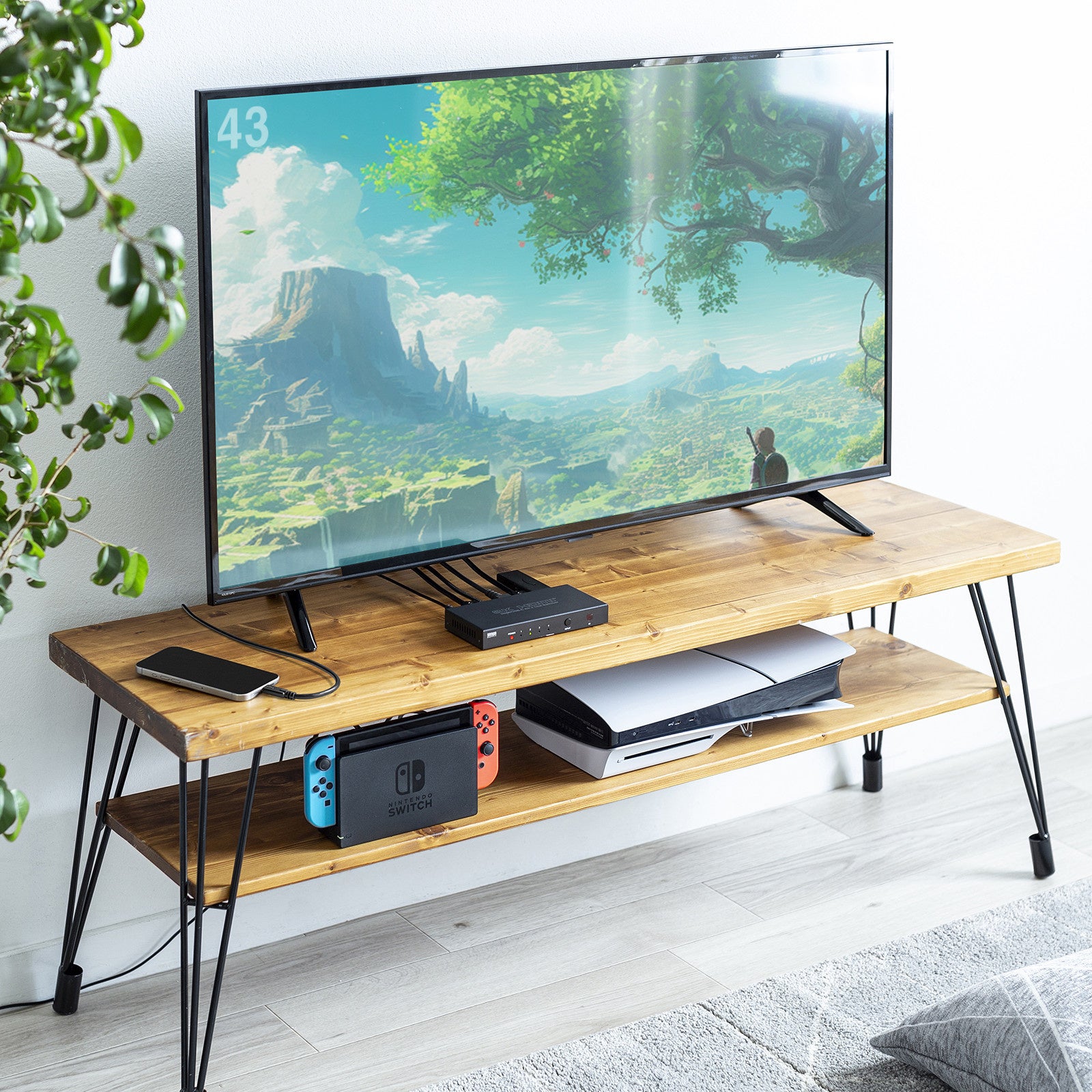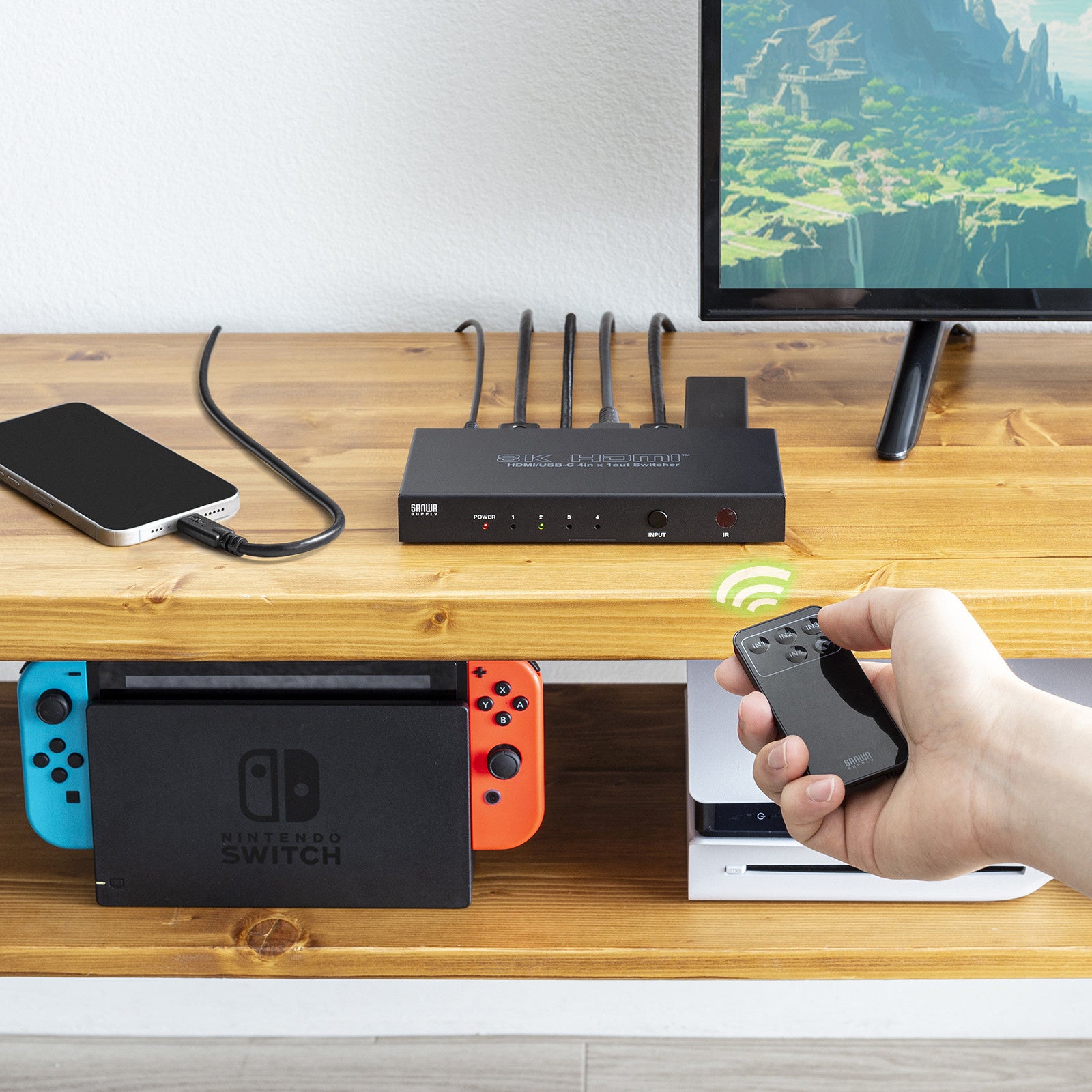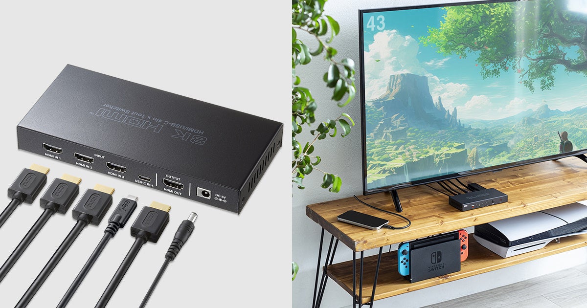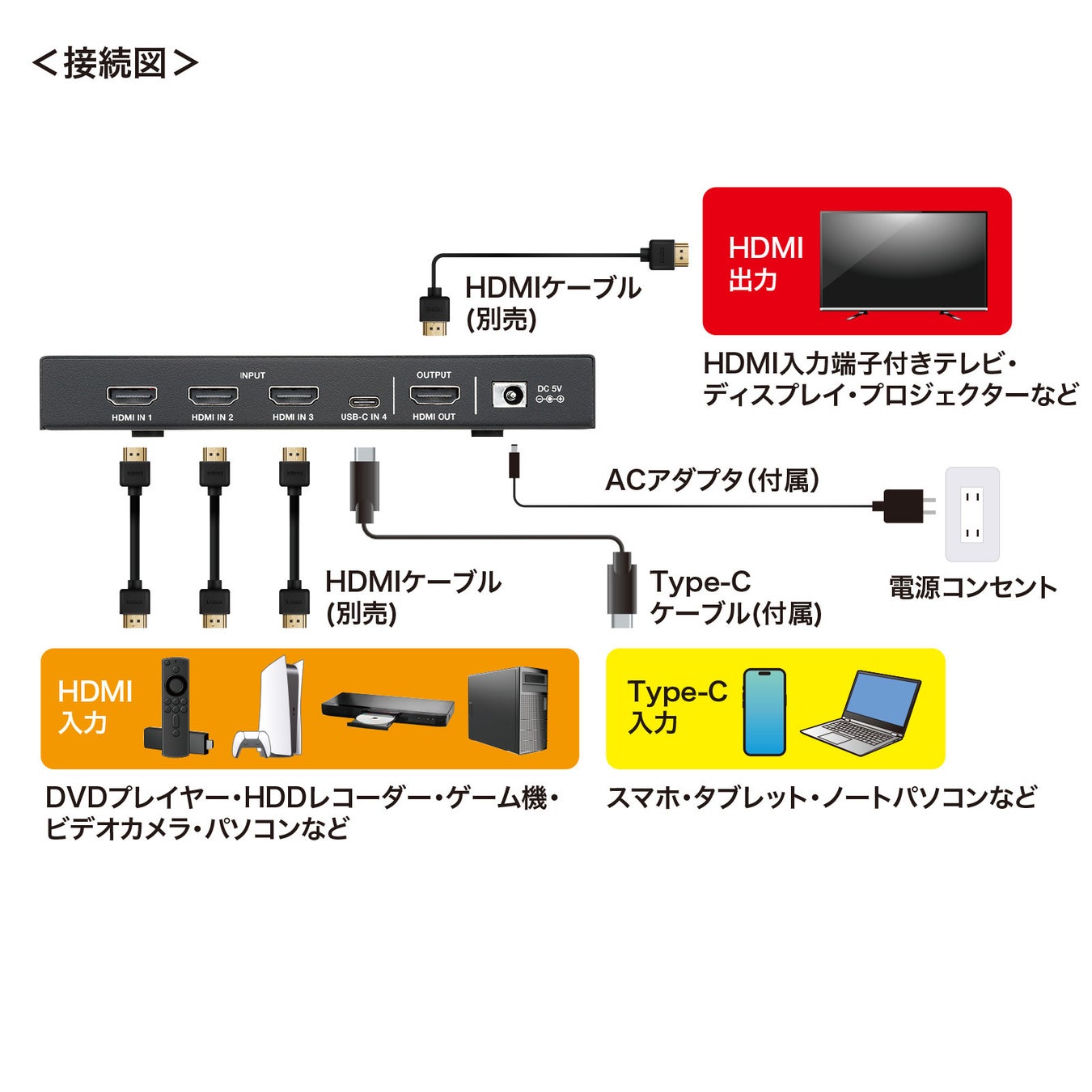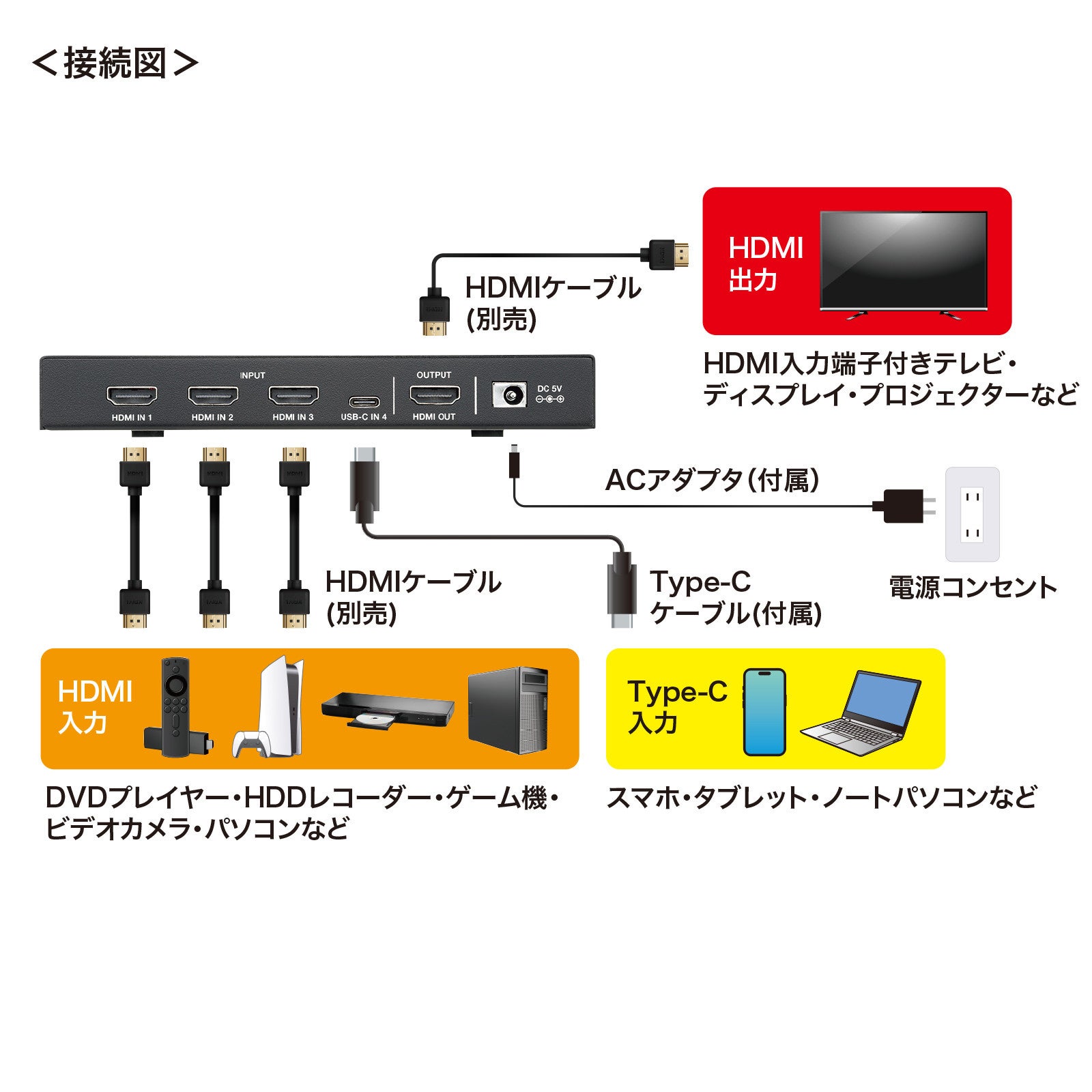 HDMI機器3台とType-C出力を持つ機器1台(DisplayPort Alt Modeに対応したスマートフォンやパソコンなど)を切り替えて1台のテレビへHDMI出力できる4入力・1出力のHDMI切替器です。