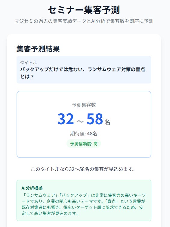 マジセミ株式会社(本社:東京都千代田区、代表取締役社長:寺田雄一)は、BtoBウェビナー向けに、ウェビナーのタイトル案を入力するだけで、AIがマジセミの年間1,400回以上のウェビナー開催データから集客数を予測する、新ツールの提供を開始したことをお知らせします。